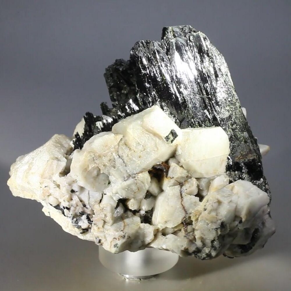 Beautiful green-black Aegirine crystal blades from Mount Malosa, Malawi with cream coloured Orthoclase crystals.
