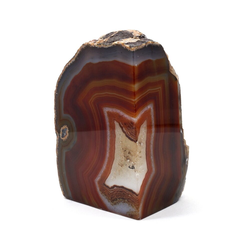Agate is usually formed in the intense heat of volcanic rock. The different bands are created by variation of cooling and mineral content when the molten rock is gradually solidifying. Finally, quartz crystals grow to create the glittering central cavity.