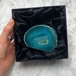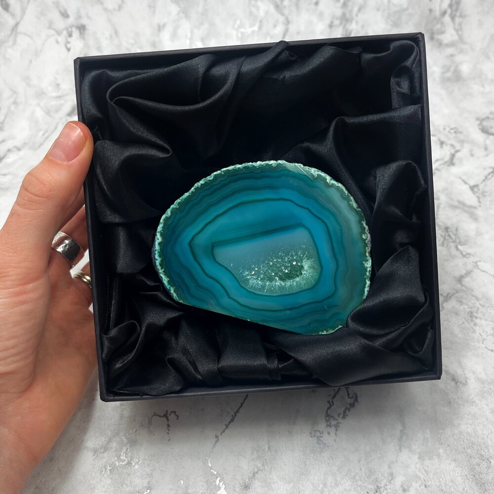 This Agate Geode is presented in a luxurious gift box. The gift box is matte black with a black satin interior and it makes the geode an extra special gift for any occasion.