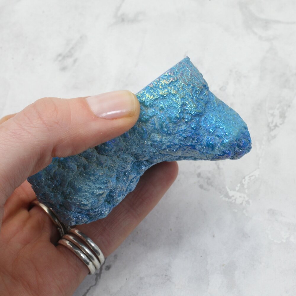 Aura Quartz is created by coating the surface of natural quartz with a layer of various metals. The coatings are extremely thin and create a beautiful iridescent effect by refracting light as it passes through the coating.