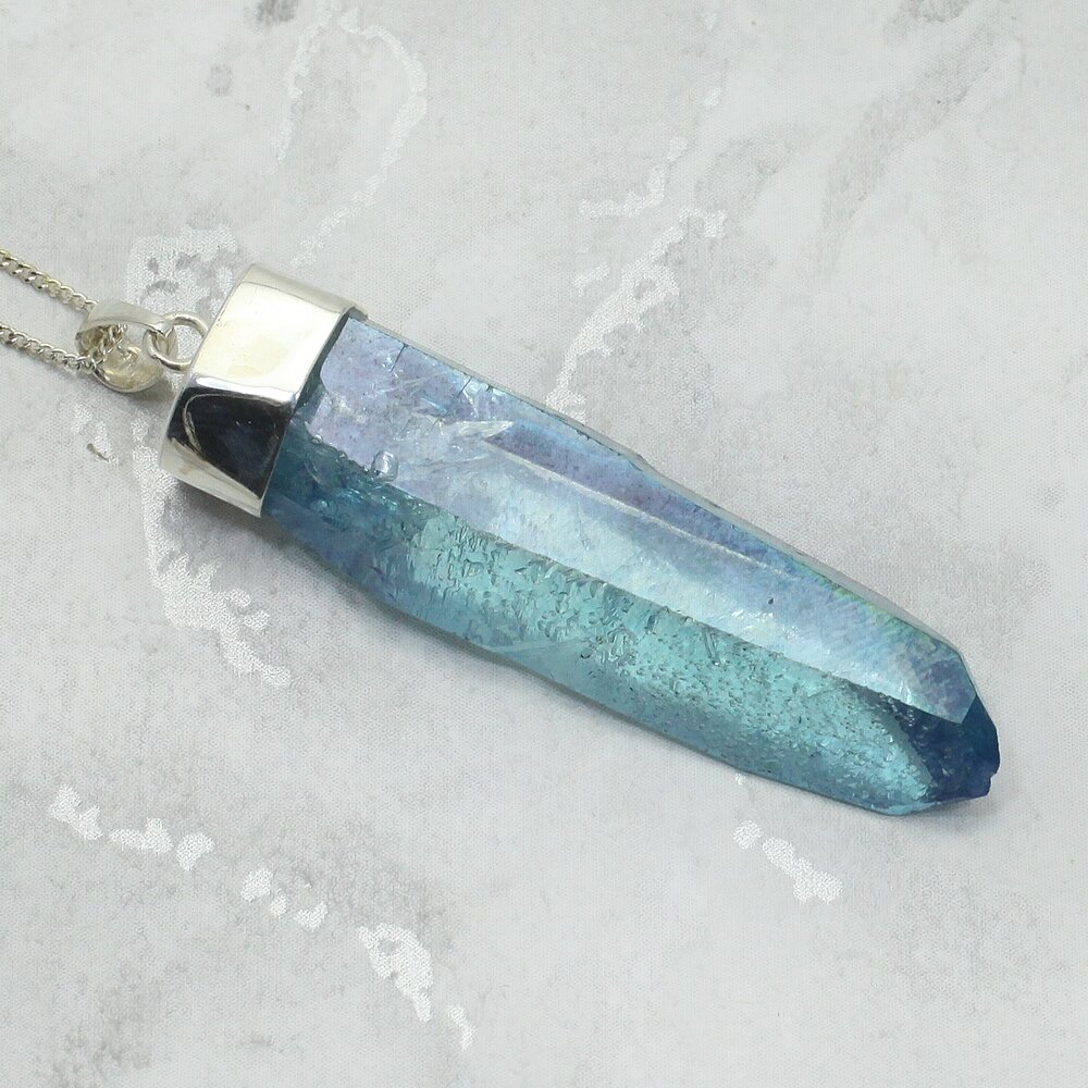 This uniqueAqua Aura Quartz Point Healing Crystal 925 Silver Pendant is set in a 925 sterling silver bail.