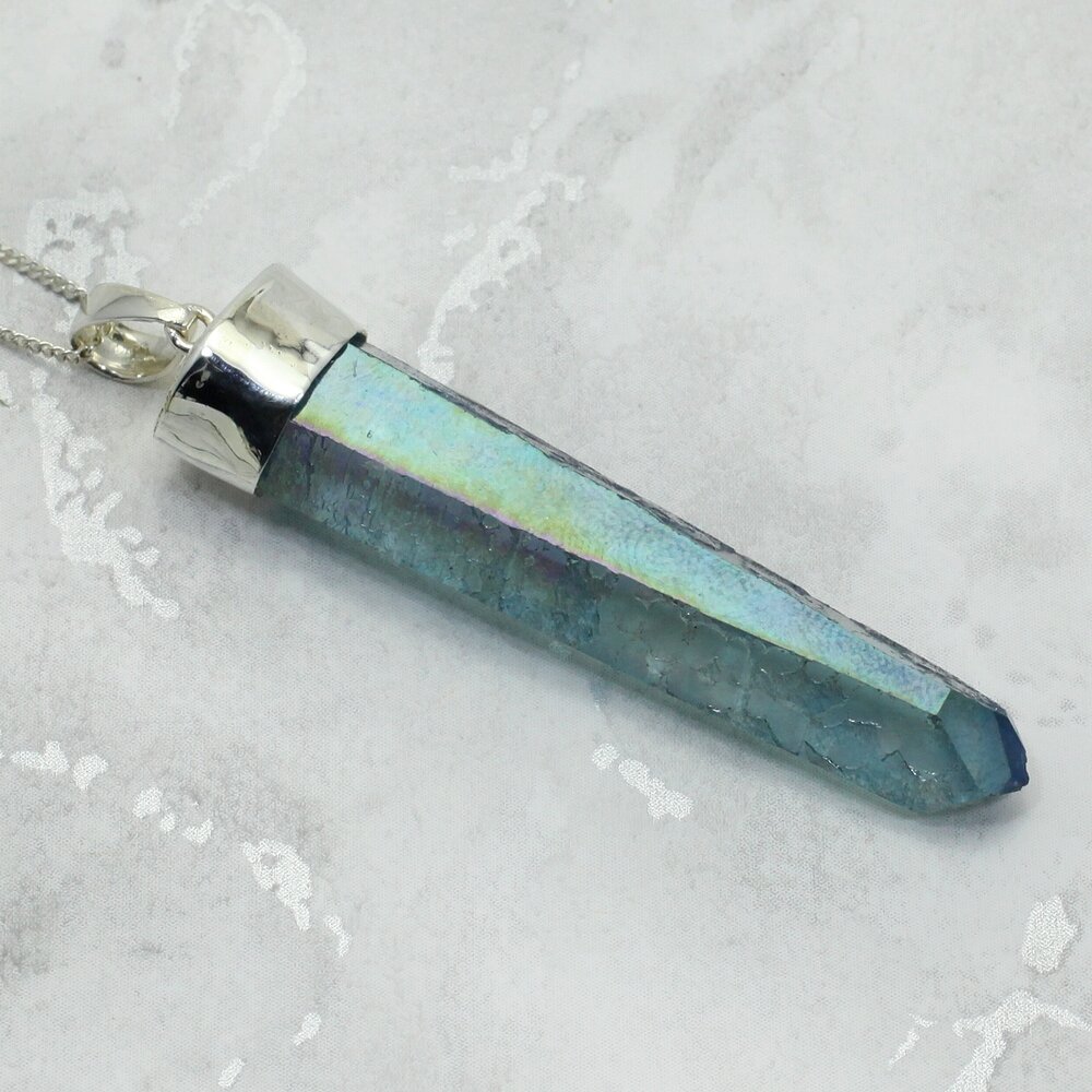 This uniqueAqua Aura Quartz Point Healing Crystal 925 Silver Pendant is set in a 925 sterling silver bail.