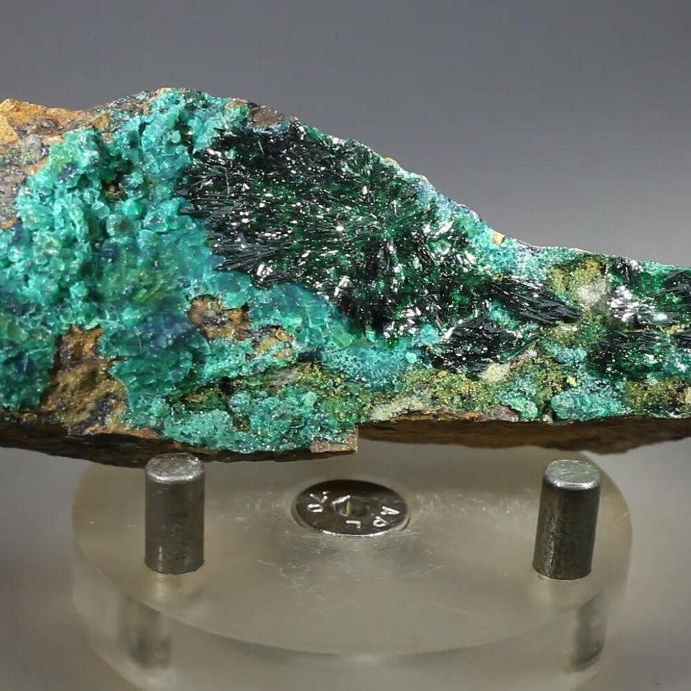 An attractive specimen of Atacamite. from the famous La Farola Mine, in the Atacama region of Chile. The specimen displays radiating groups of lustrous crystals of the deepest green sitting on blue-green Chrysocolla.