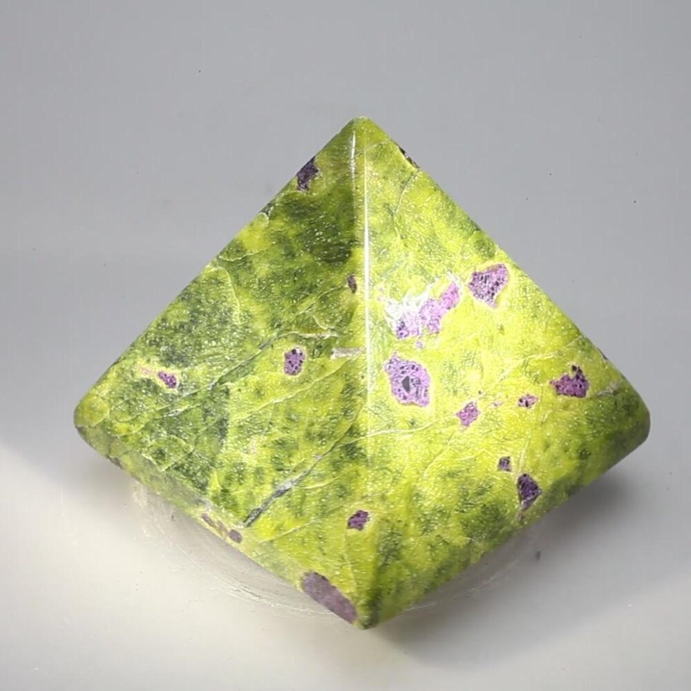Choose wonderful colour with this eye-catching Atlantisite Pyramid. Atlantisite is an unusual combination of green serpentine with inclusions of purple stichtite. This pyramid displays fine colouration of both minerals.