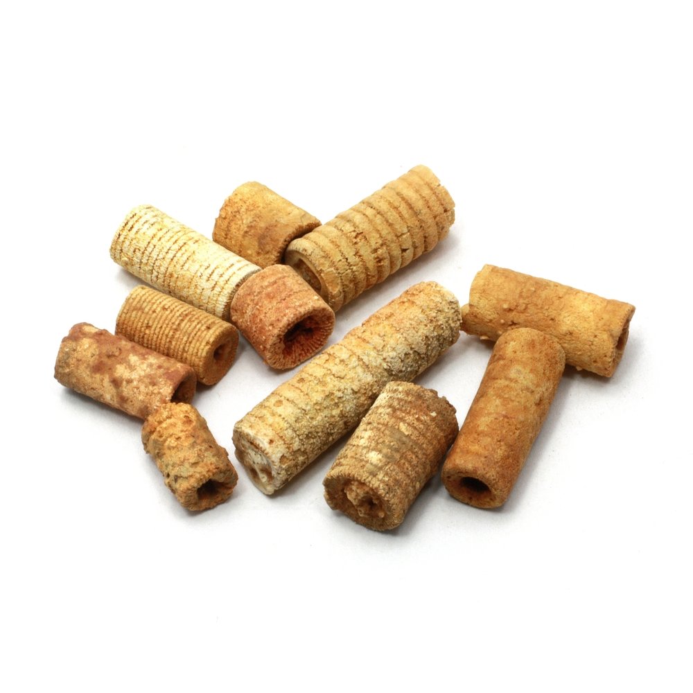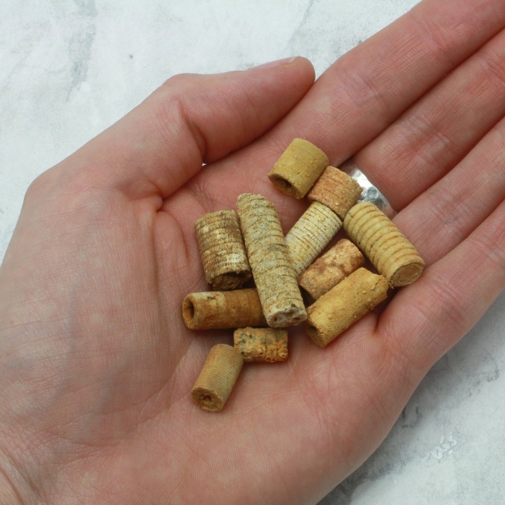 Each bag will contain appoximately 20g of Crinoid Stems in mixed sizes. The pictures shows an example of 20g of stems. Each piece is unique and they vary slightly in size and shape.