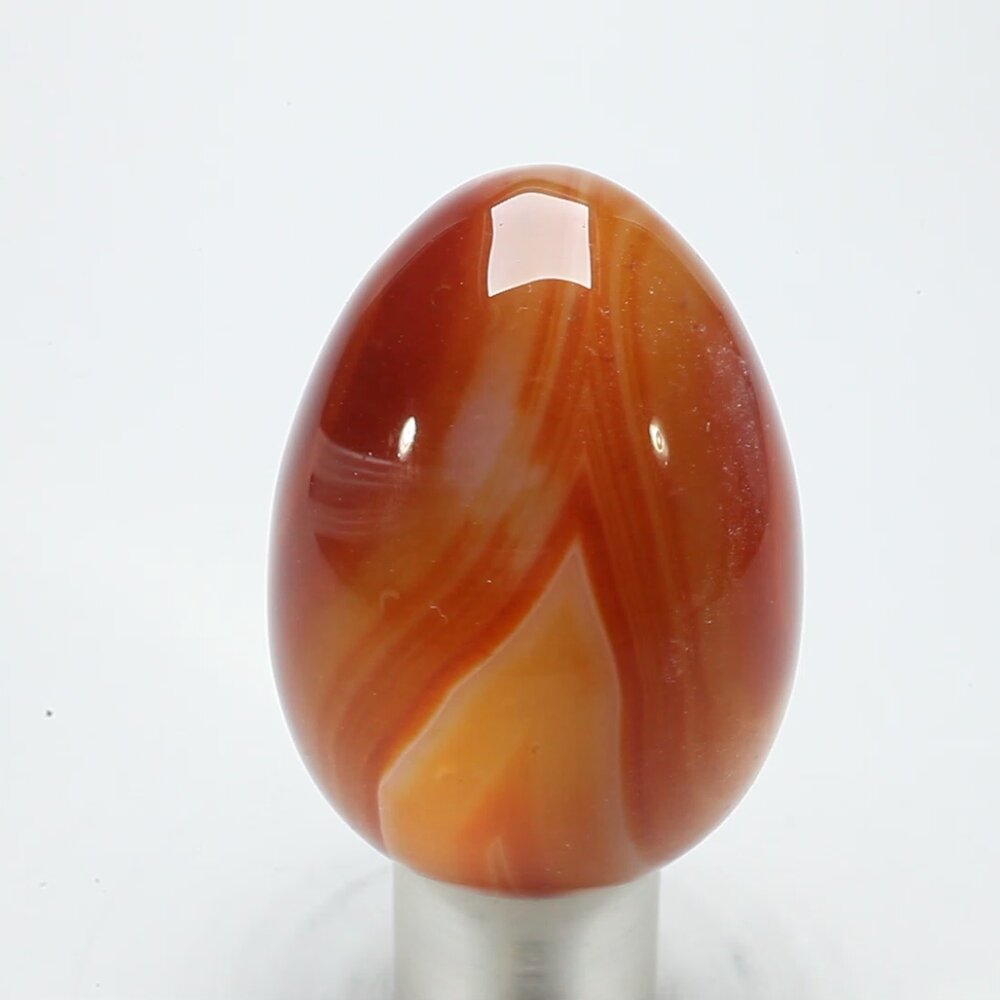 Enjoy beautiful crystal colour with this fine Banded Red Carnelian Crystal egg. This example has particularly striking and attractive white banding contrasting beautifully with the warm reds and oranges of the carnelian.