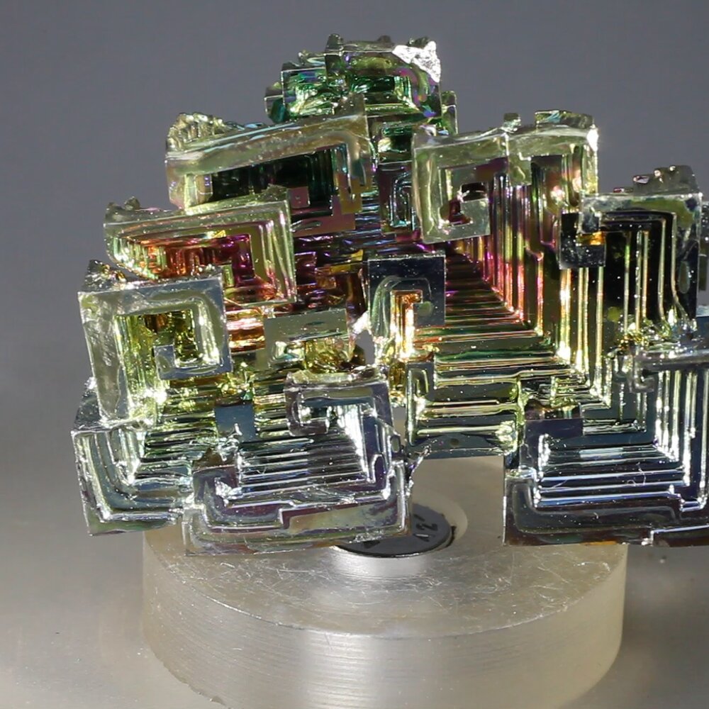 (This refers to lab-grown multi-coloured bismuth): Bismuth's beautiful rainbow colours awaken and align the entire chakra system and corresponding layers of the energy body, while at the same time bringing a sense of presence in the physical body and connectedness with the Earth.