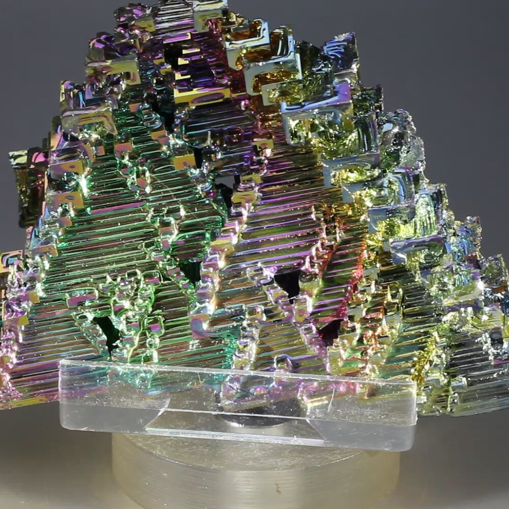 (This refers to lab-grown multi-coloured bismuth): Bismuth's beautiful rainbow colours awaken and align the entire chakra system and corresponding layers of the energy body, while at the same time bringing a sense of presence in the physical body and connectedness with the Earth.