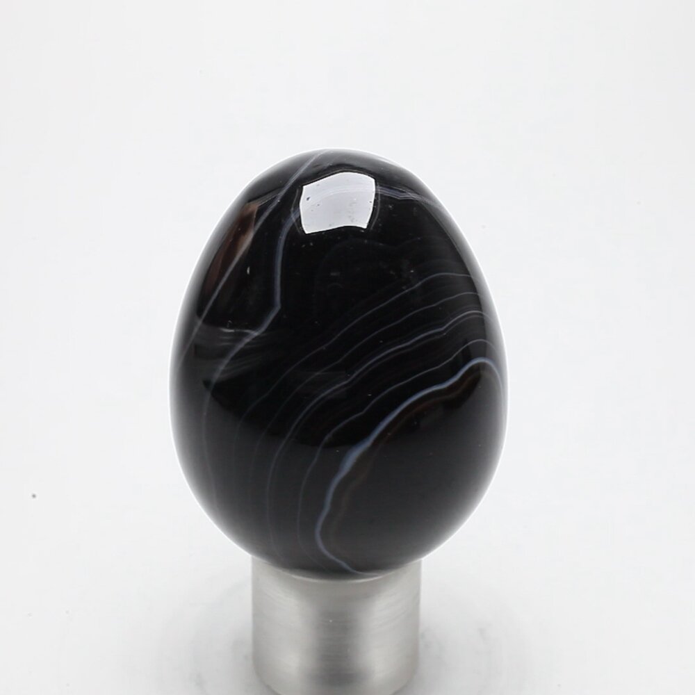Enjoy beautiful crystal colour with this fine black onyx gemstone egg. This example has particularly striking and attractive white banding contrasting beautifully with the jet black onyx.