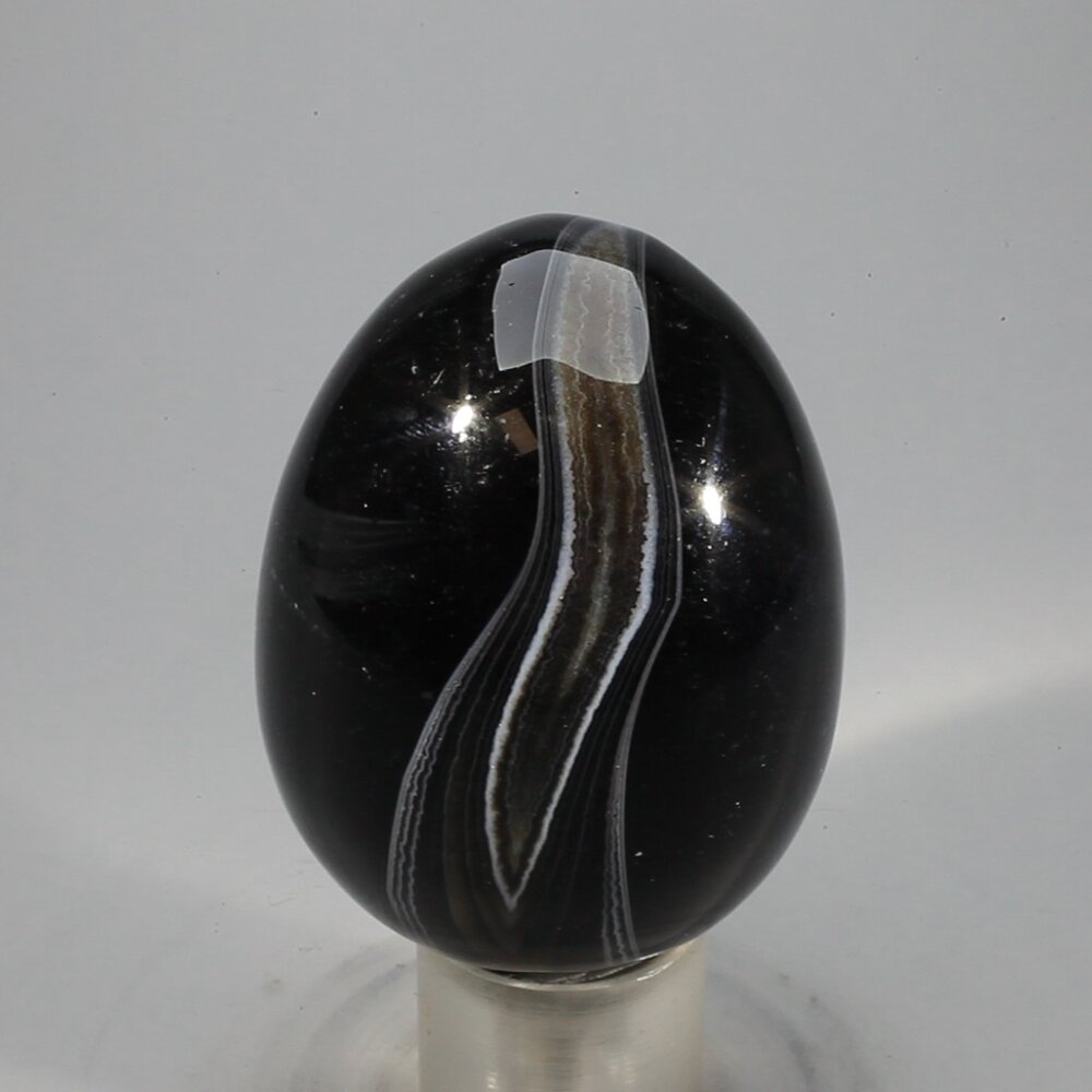 Enjoy beautiful crystal colour with this fine black onyx gemstone egg. This example has particularly striking and attractive white banding contrasting beautifully with the jet black onyx.