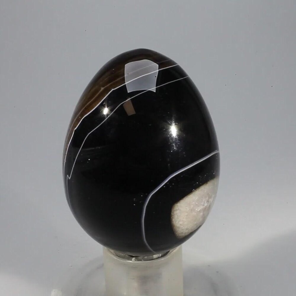 Enjoy beautiful crystal colour with this fine black onyx gemstone egg. This example has particularly striking and attractive white banding contrasting beautifully with the jet black onyx.