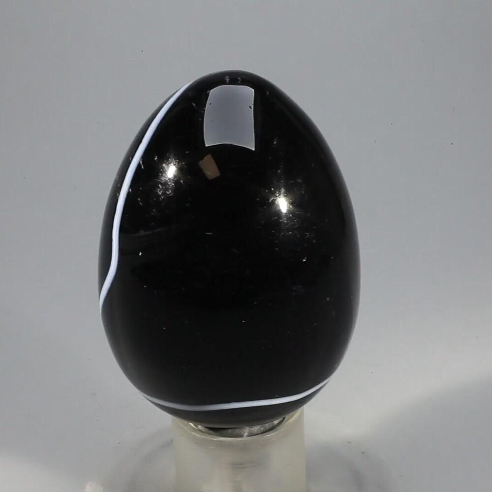 Enjoy beautiful crystal colour with this fine black onyx gemstone egg. This example has particularly striking and attractive white banding contrasting beautifully with the jet black onyx.