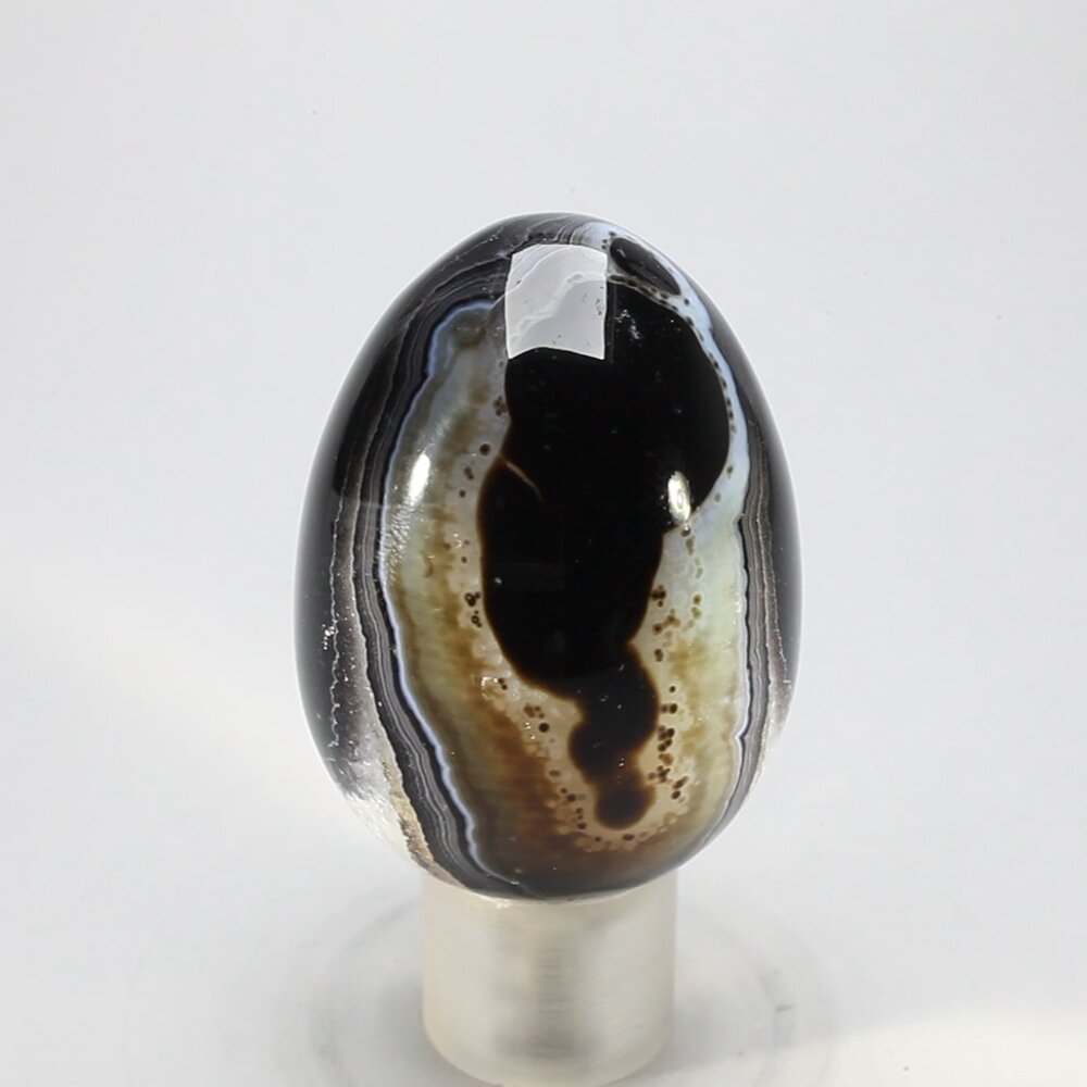Enjoy beautiful crystal colour with this fine black onyx gemstone egg. This example has particularly striking and attractive white banding contrasting beautifully with the jet black onyx.