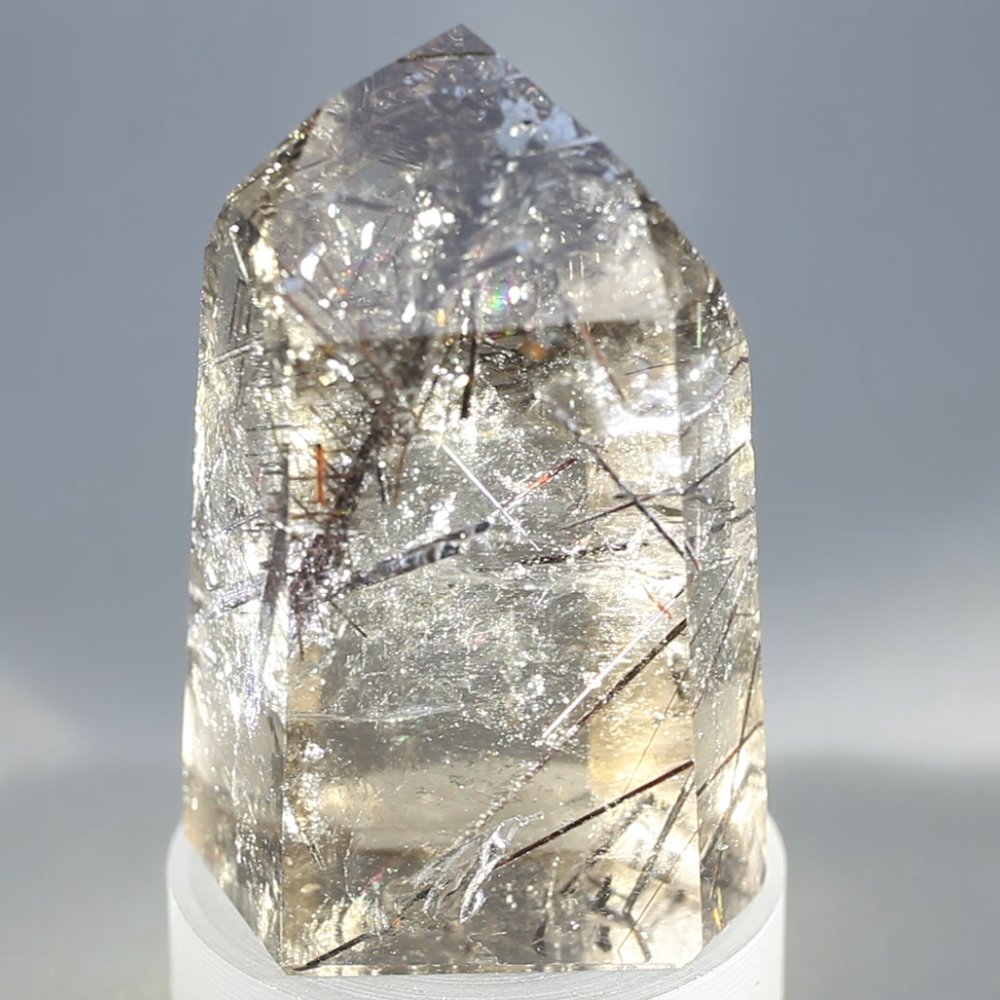 A stunning Polished Rutilated Smoky Quartz Point struck through with black tourmaline crystals creating internal plains that really catch the light.