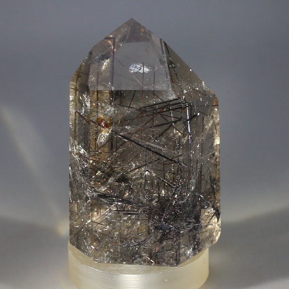 A stunning Polished Rutilated Smoky Quartz Point struck through with black tourmaline crystals creating internal plains that really catch the light.