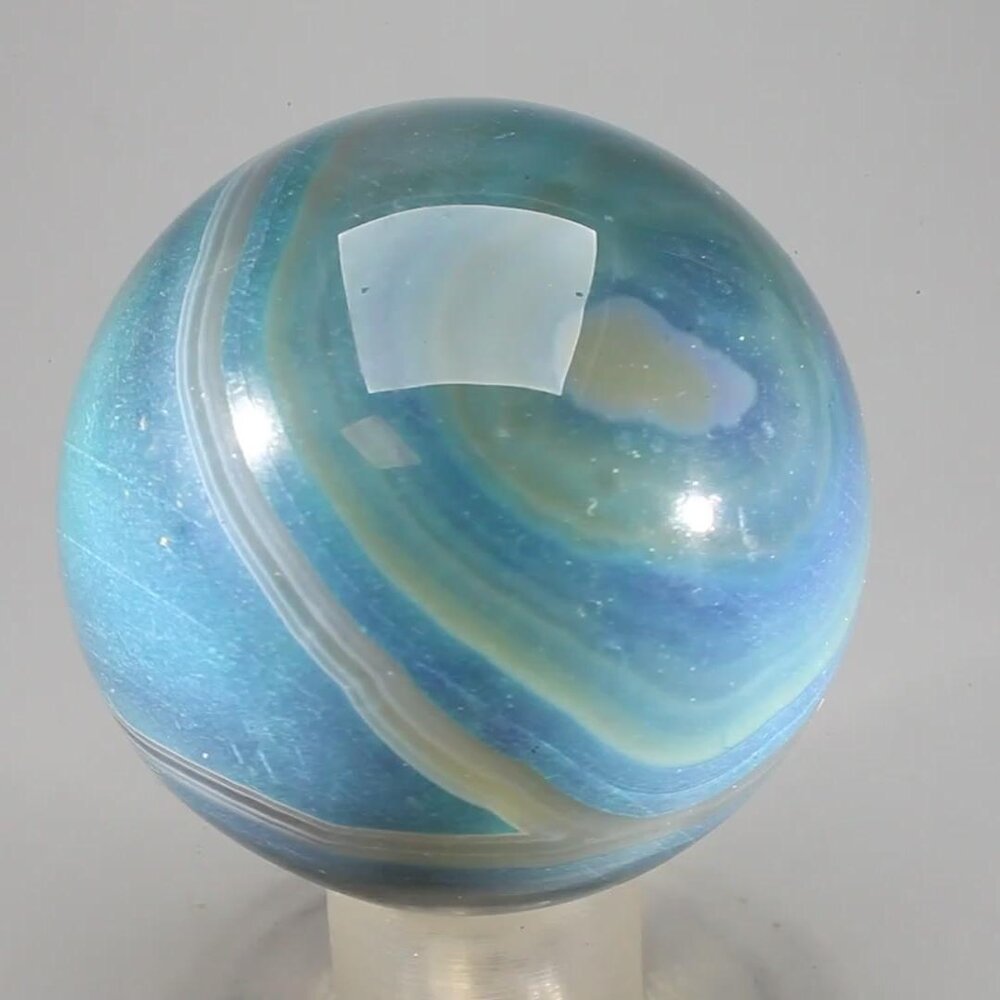Bring home remarkable natural colour with this blue banded agate crystal ball. This crystal ball displays excellent banding, with continuous bands around the circumference of the sphere. It has a lovely range of colour including deep royal blue and contrasting white.