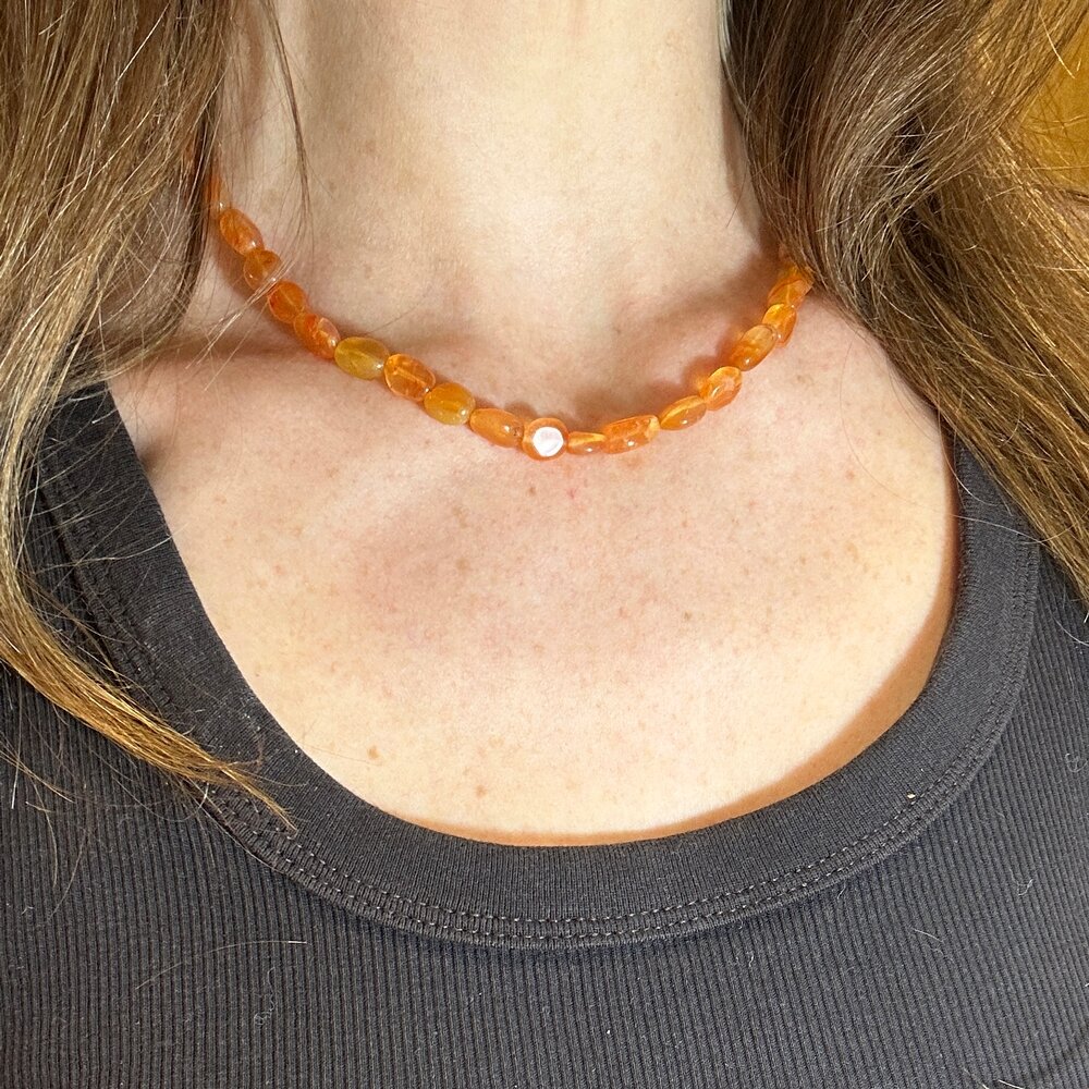 Brighten up your look with this Carnelian Gemstone Necklace. This necklace features carnelian nuggets (~10mm beads) with a gorgeous flame-orange colour. It has a very natural, pretty look that goes with many outfits.