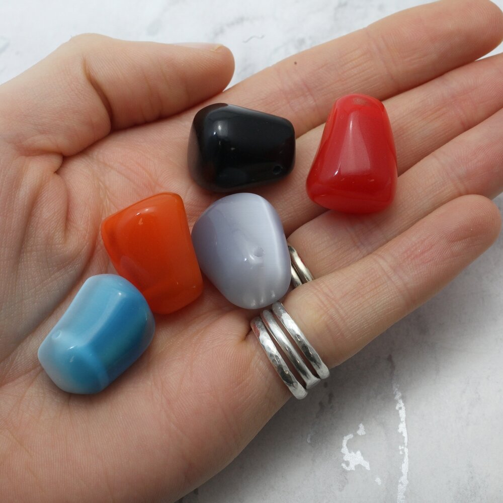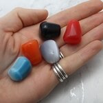 A beautiful collection of 5 mixed colour Cat's Eye Tumble Stone Pendants. These pre-drilled Tumblestones have a minimum 1.5mm hole, which allows you to add them to a cord.