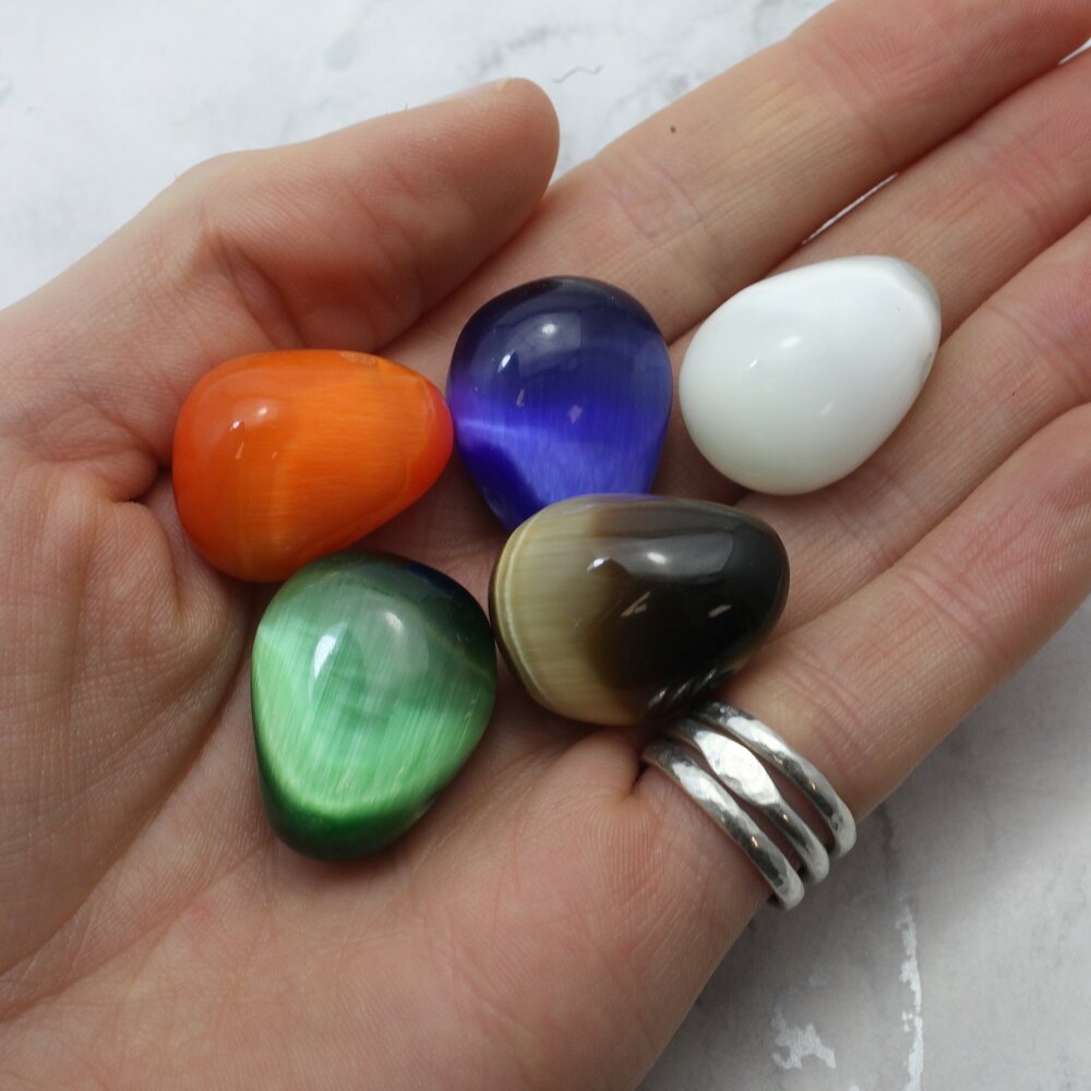 A beautiful collection of 5 mixed colour Cat's Eye Tumble Stone Pendants. These pre-drilled Tumblestones have a minimum 1.5mm hole, which allows you to add them to a cord.