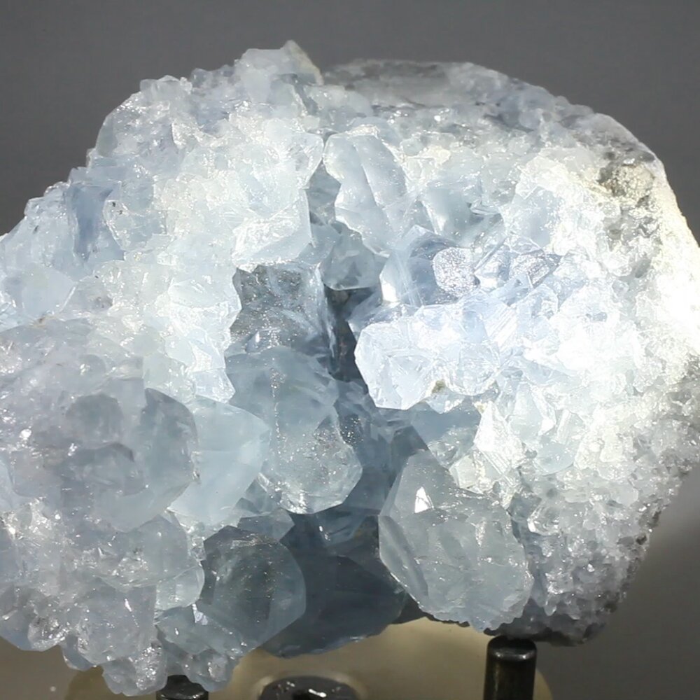 Celestite has a heavenly pale blue that cools and refreshes other colours and crystals. The well-formed crystals are slightly flattened, as characteristic of celestite and fill with light when displayed in natural light. One of the Celestial Communication Stones, Celestite is said to create the peace needed to align with higher states of consciousness and yet remain grounded. It is also reputed to be good for calming those with a fear of heights or of air travel.