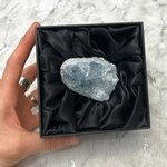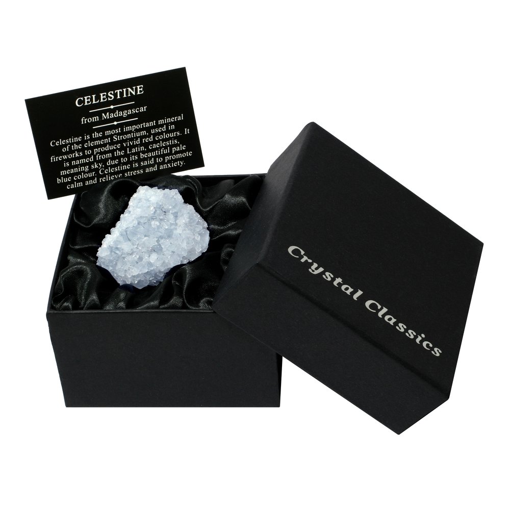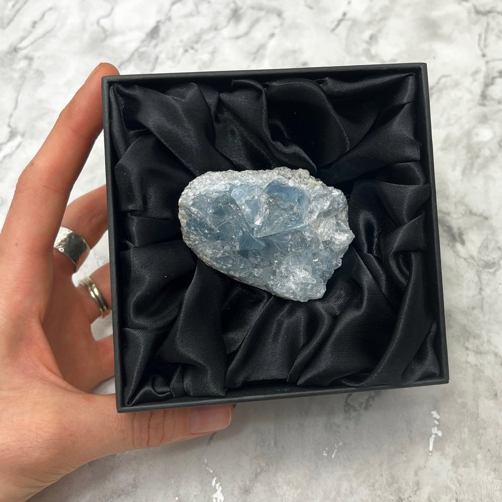 This Celestite is presented in a luxurious gift box. The gift box is matte black with a black satin interior and it makes the Celestite an extra special gift for any occasion.