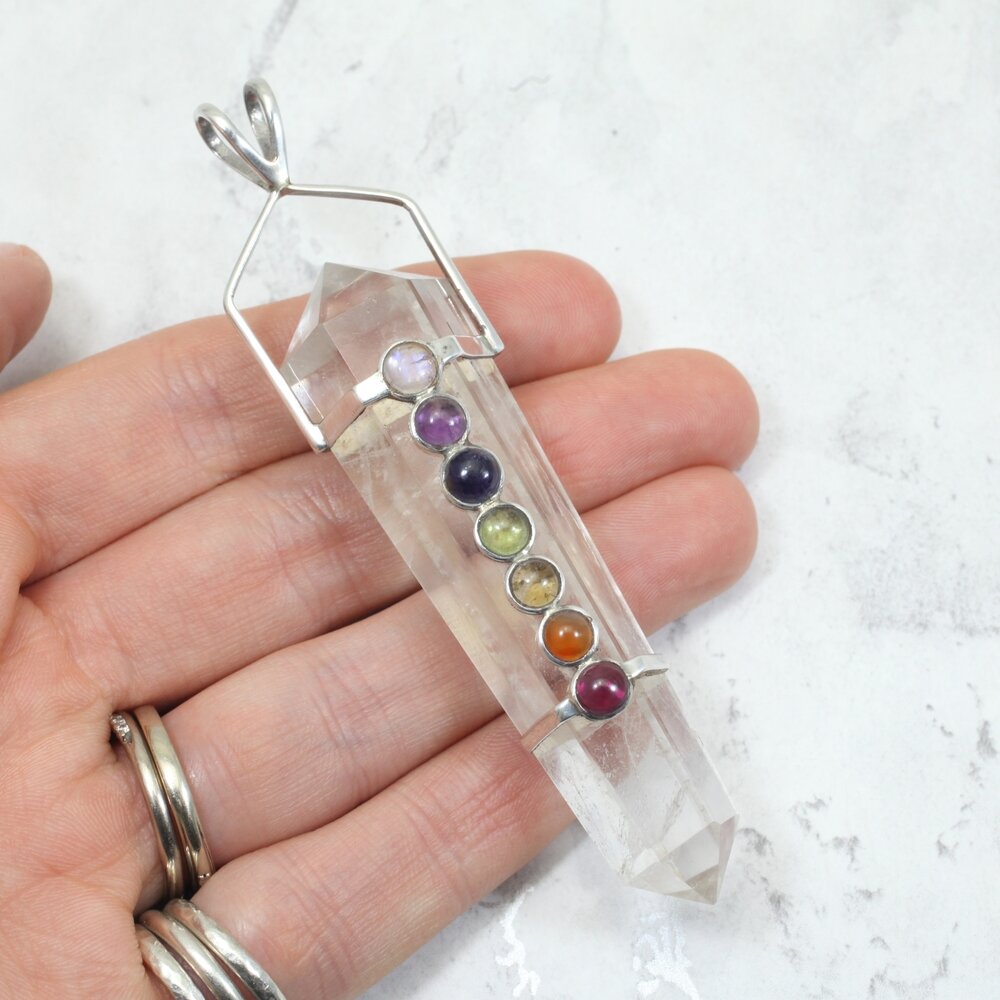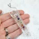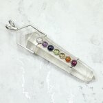 This Quartz & Chakra Pendant allows the radiance of the Seven Chakra Stones to shine. The stones are set simply in silver on a quartz point, allowing the light to shine through the stones themselves.