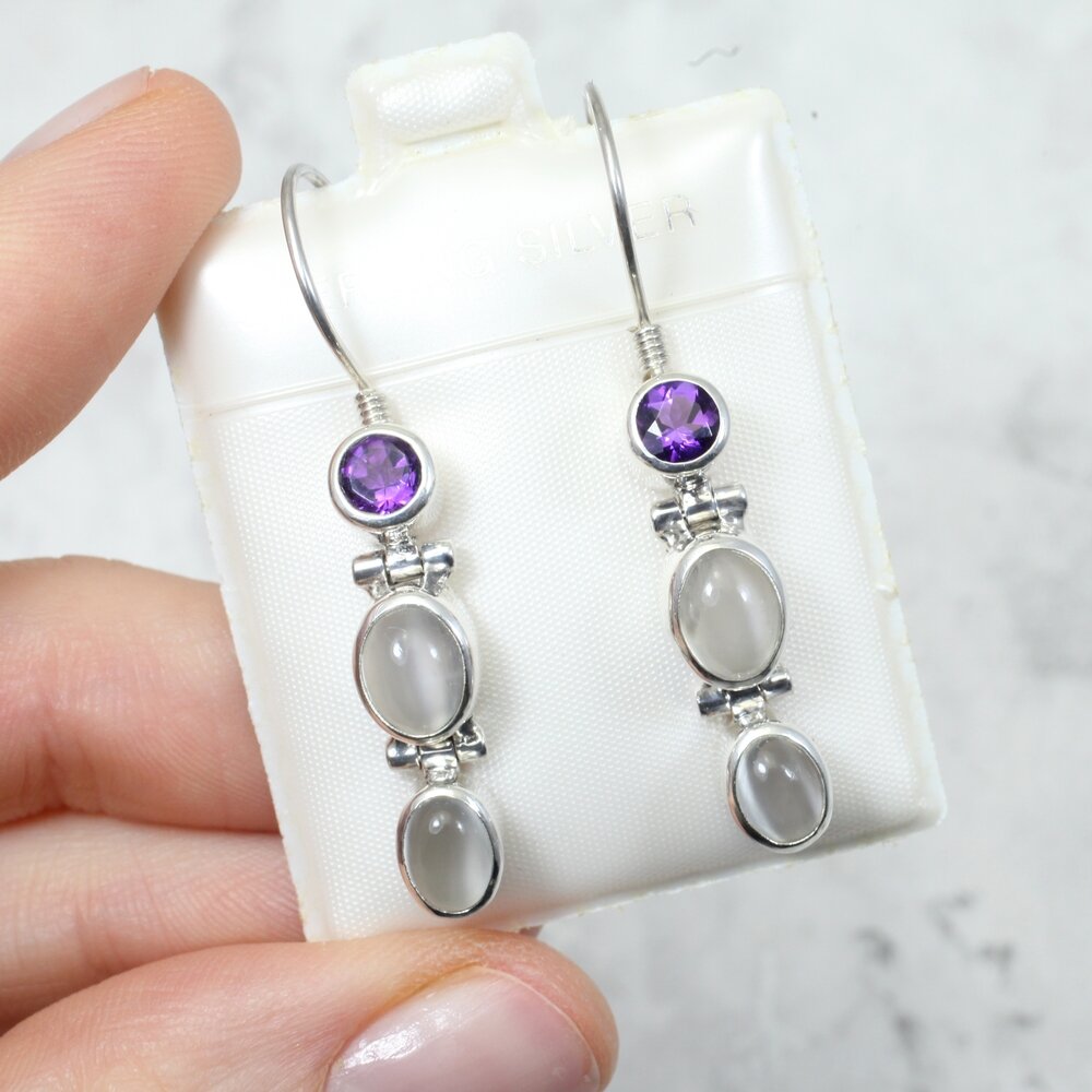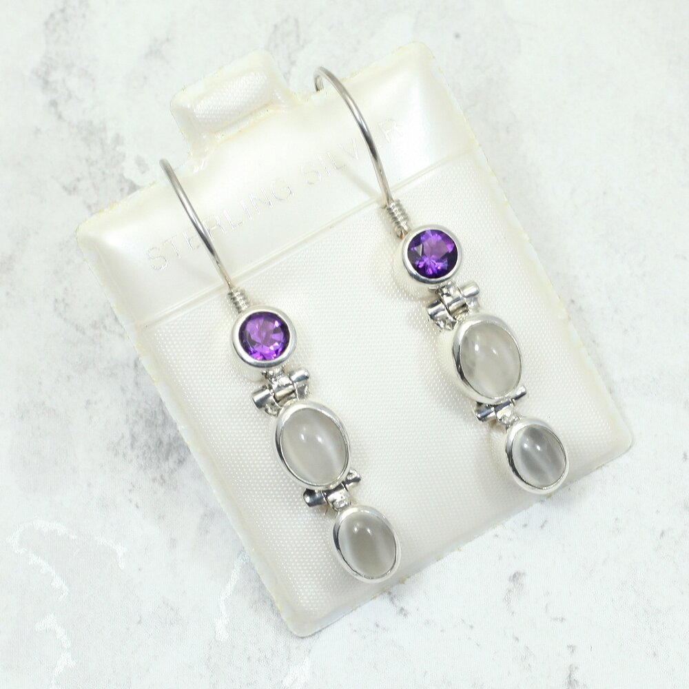 Chalcedony & Faceted Amethyst 925 Silver Drop Earrings.