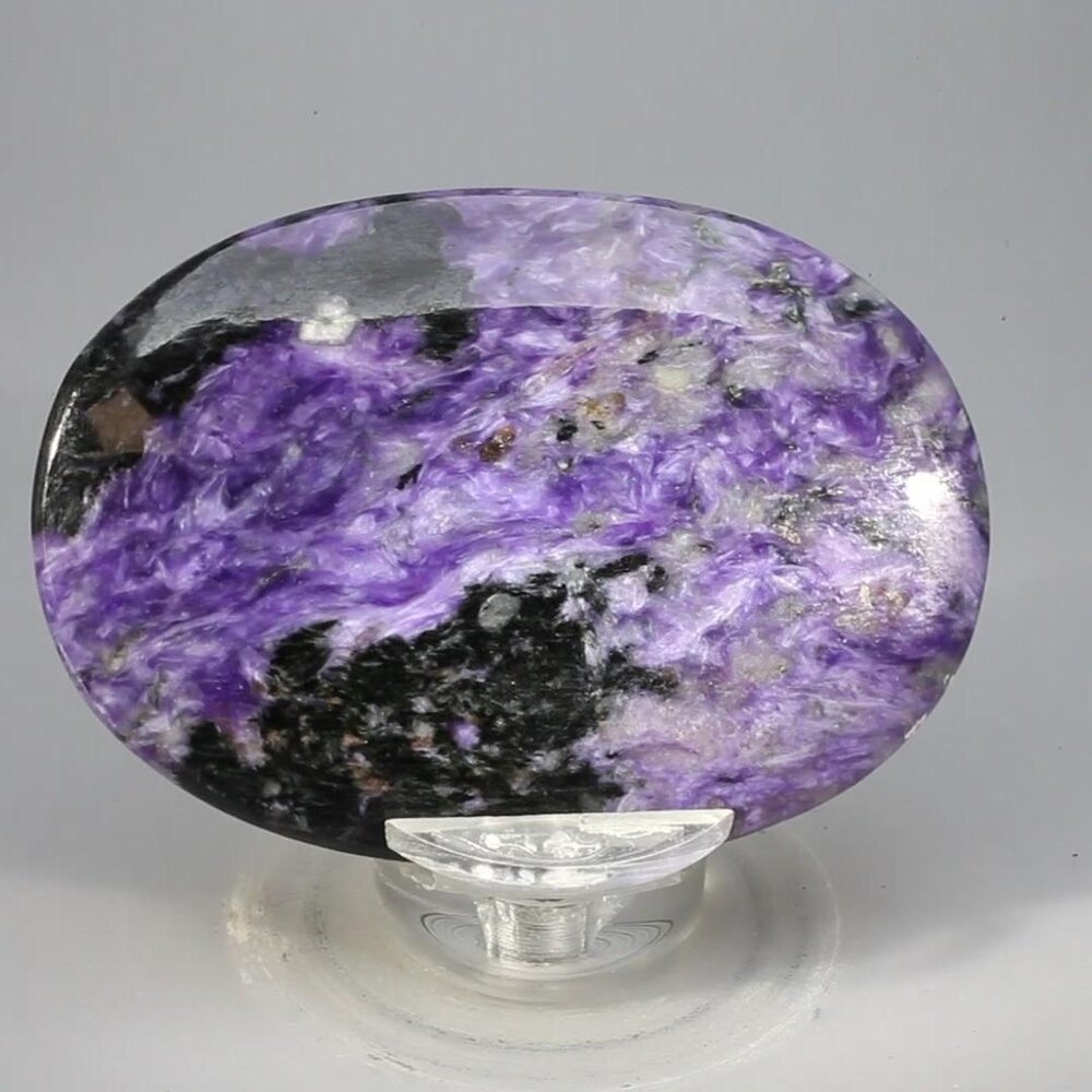 Charoite is a rare crystal found only in the Charo River region of Russia. It is believed to turn negativity into positivity. Charoite is considered highly cleansing and can be used in conjunction with amethyst to accelerate healing and dispel fear. It is recommended for empowering the inner self and combating disturbed sleep. This palm stone is a great way to access the energy of charoite.