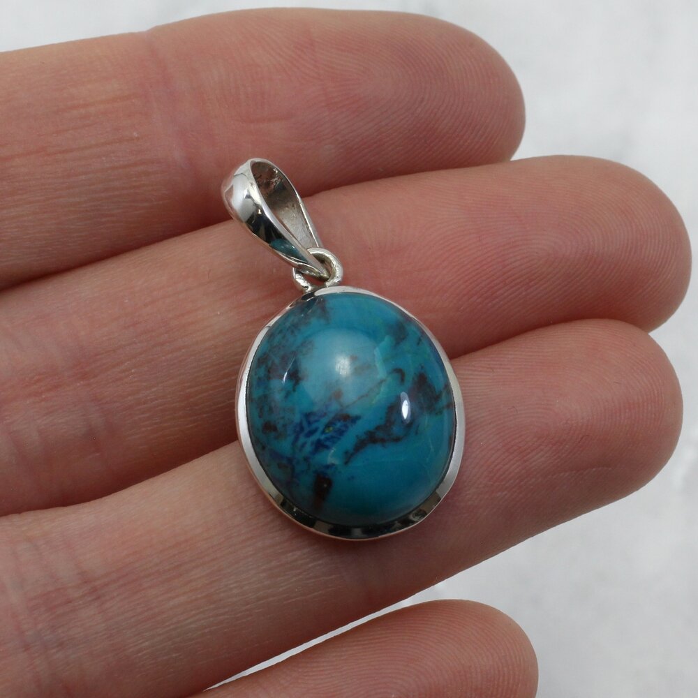 Add an unusual crystal pendant to your collection. This Chrysocolla and Silver Pendant is a beautiful example of this natural stone.