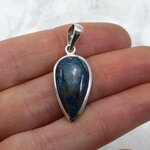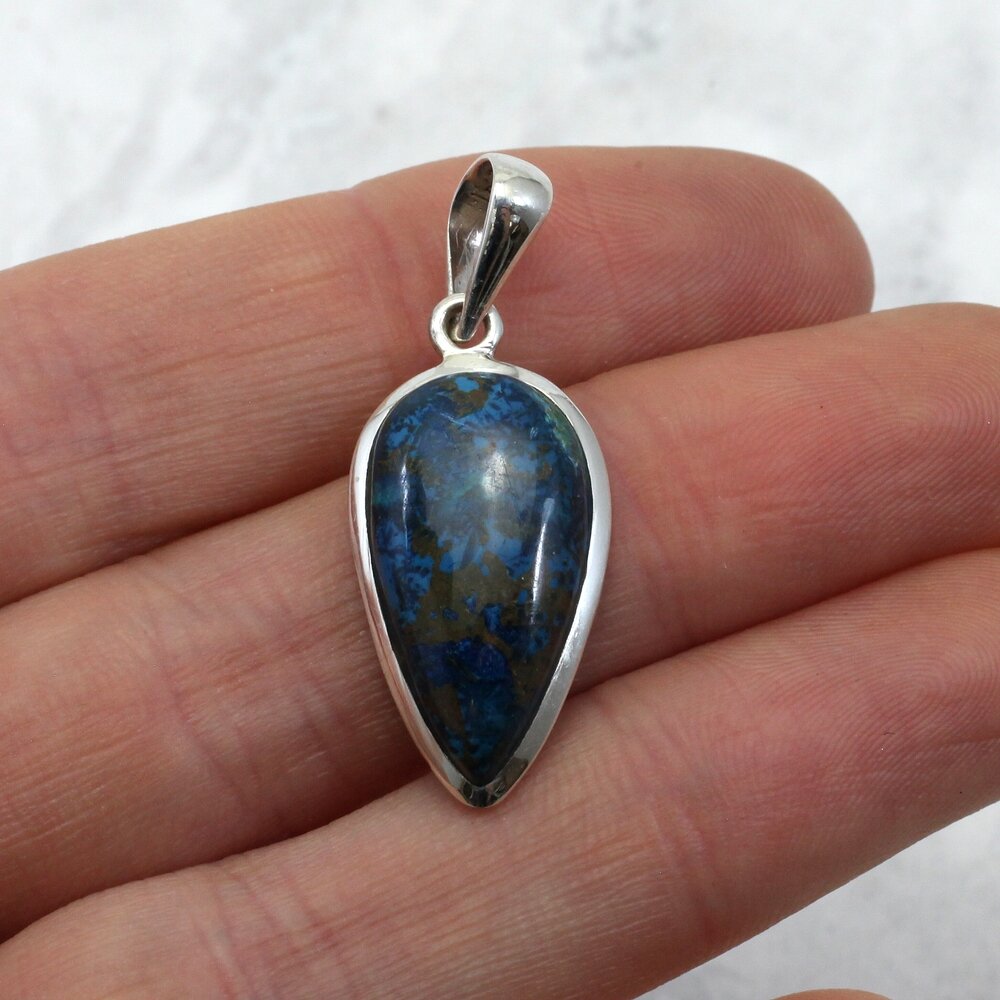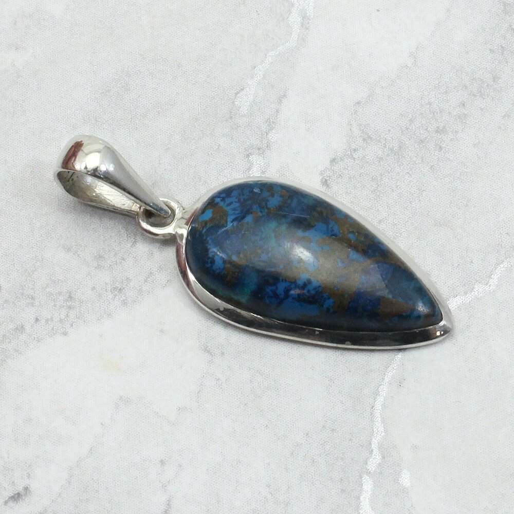 Add an unusual crystal pendant to your collection. This Chrysocolla and Silver Pendant is a beautiful example of this natural stone.