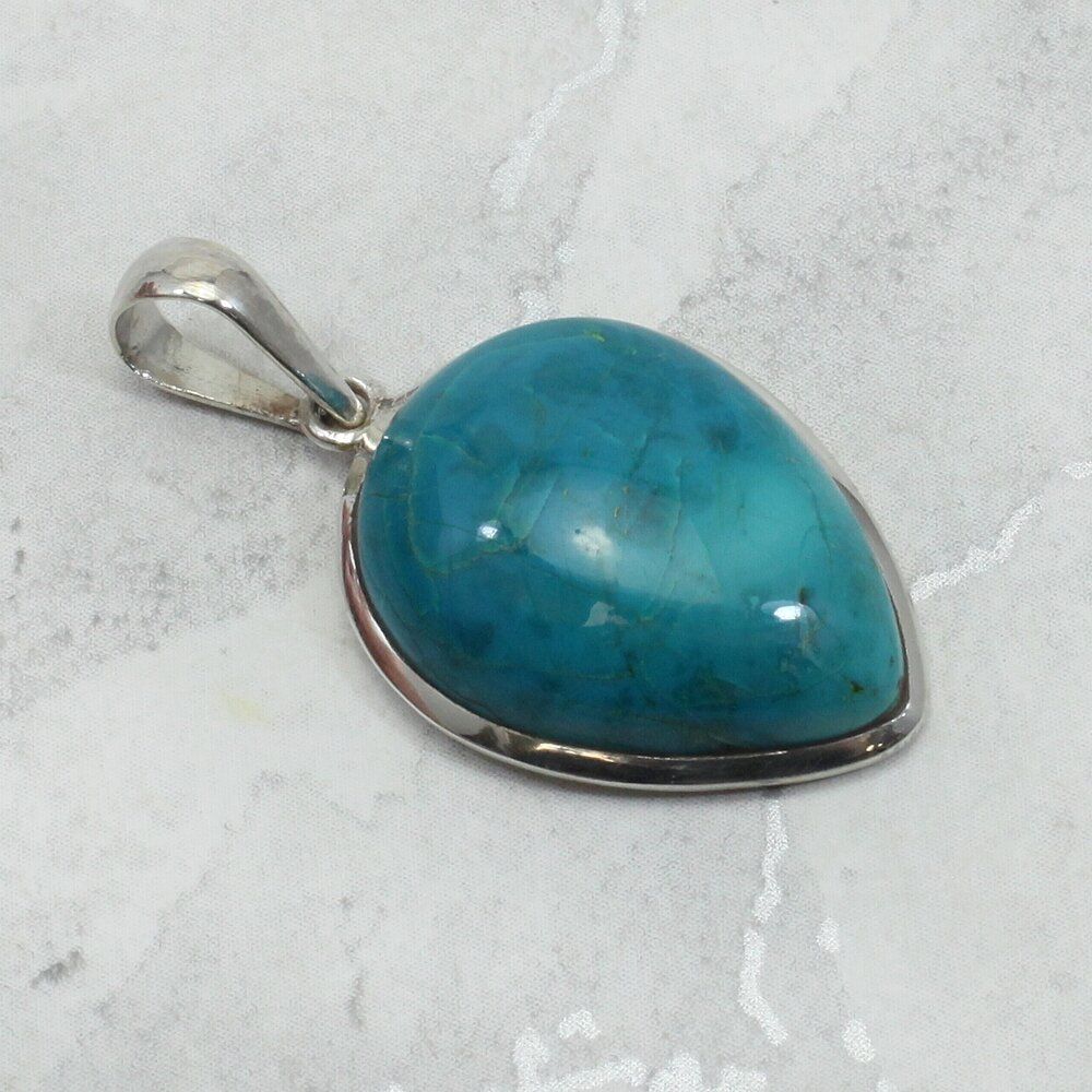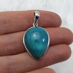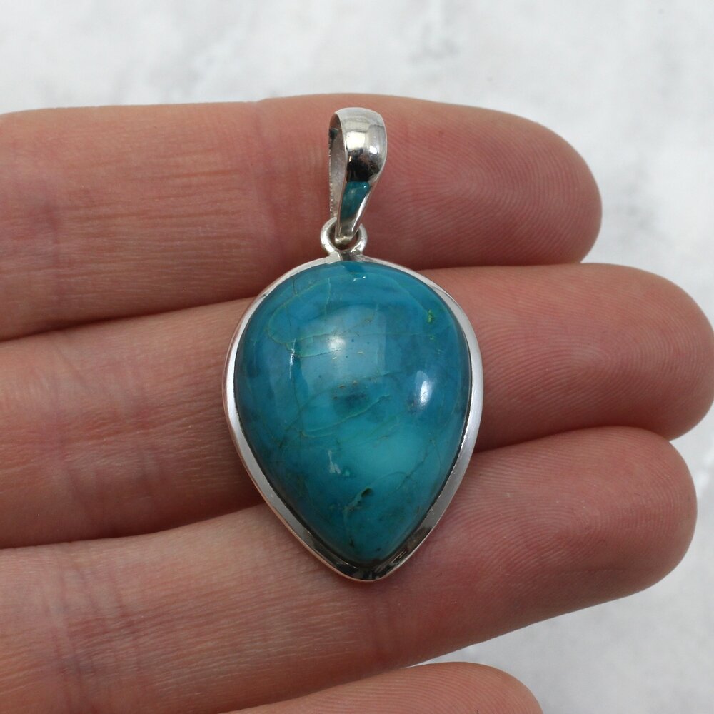 Add an unusual crystal pendant to your collection. This Chrysocolla and Silver Pendant is a beautiful example of this natural stone.