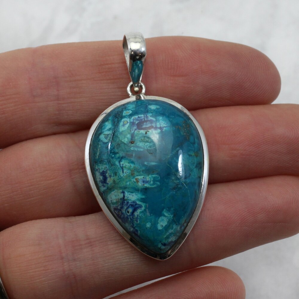 Add an unusual crystal pendant to your collection. This Chrysocolla and Silver Pendant is a beautiful example of this natural stone.