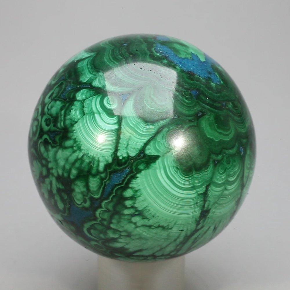 This bright and eye-catching Chrysocolla & Malachite Crystal Sphere displays a range of beautiful green and turquoise shades that are really attractive.