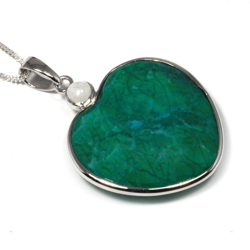 A Chrysocolla Howlite & Moonstone Heart Pendant set within a .925 sterling silver rim.