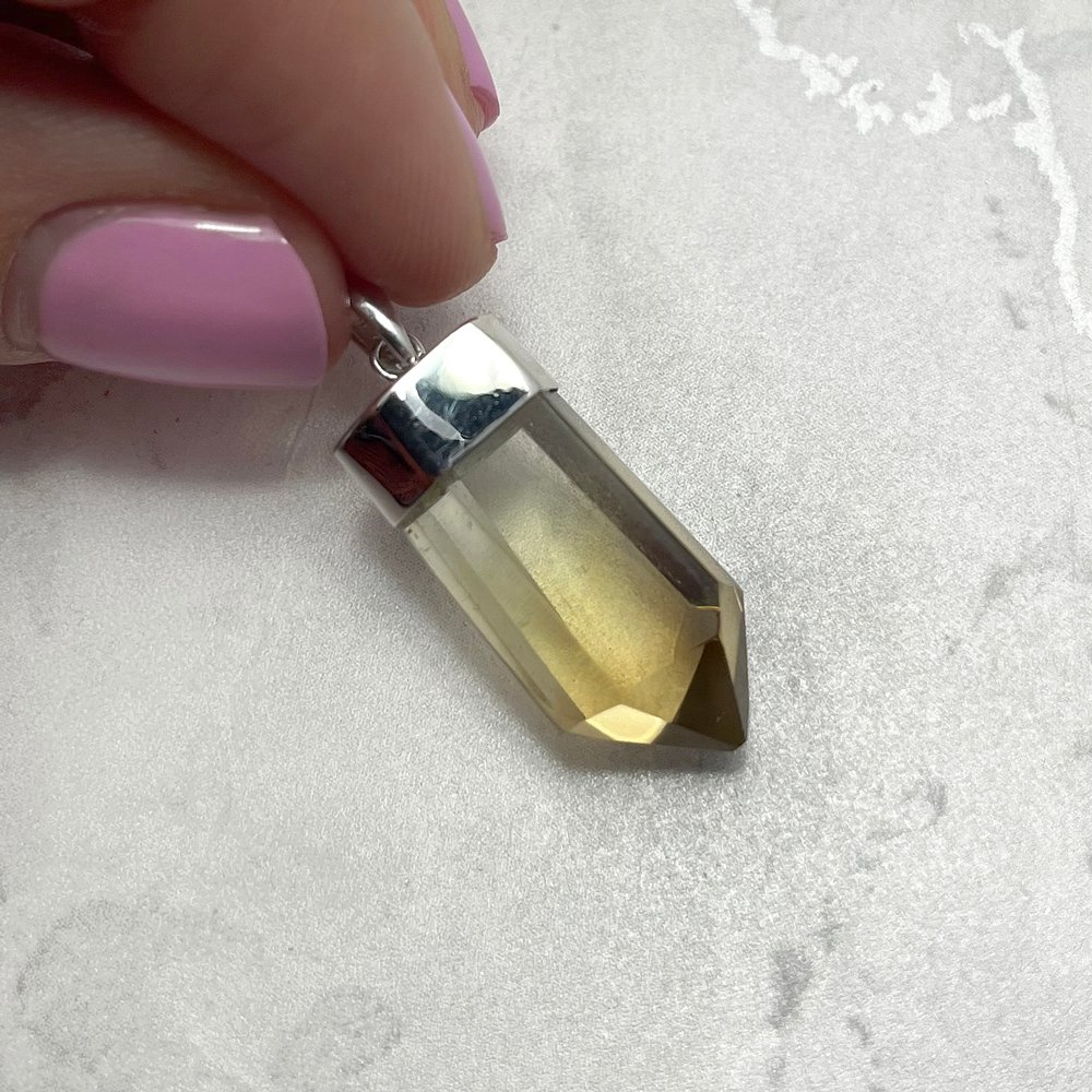 This unique Citrine Polished Point Healing Crystal Pendant is set in a 925 sterling silver cap and loop.