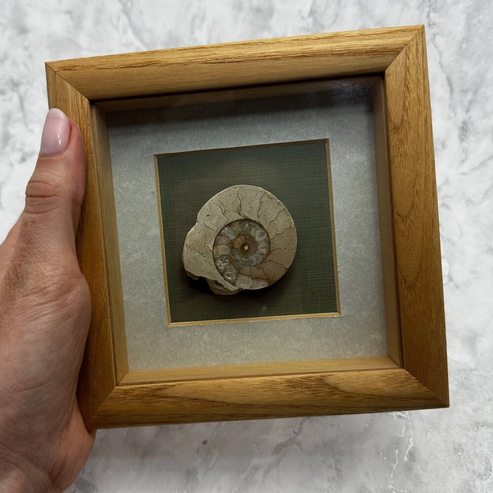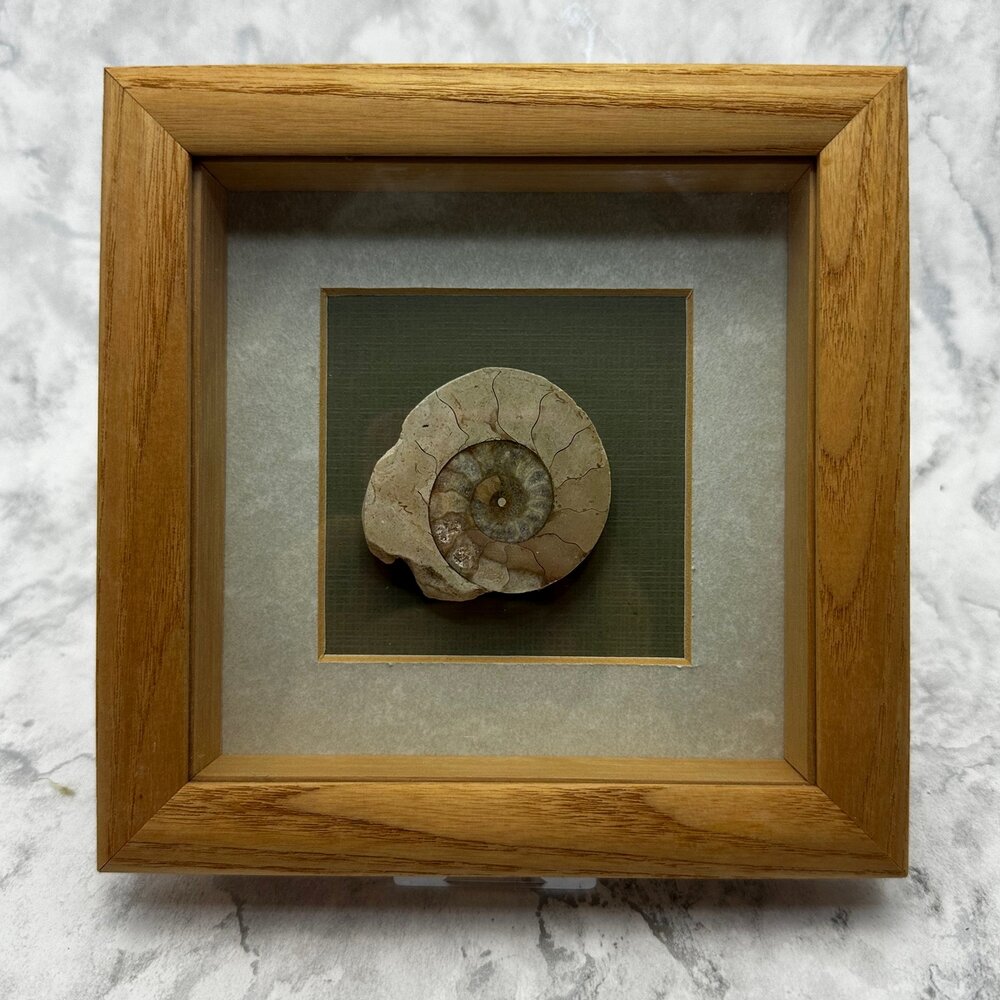 This framed Ammonite fossil has been carefully cut and polished to reveal the internal chambers of the animal's spiral shell. This is traditionally mounted and set within a stunning genuine wood frame with wall hook.