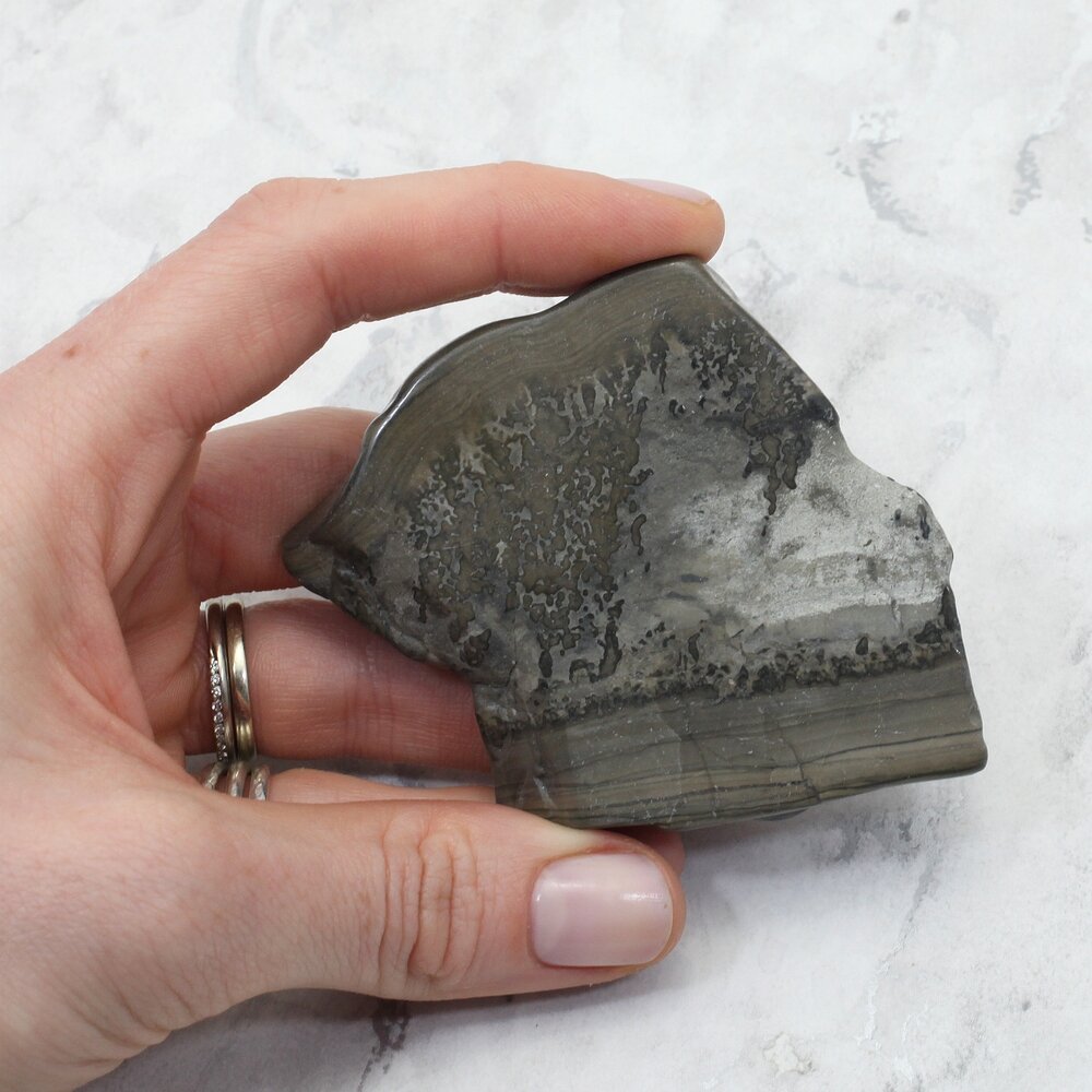 This mineral slice is cut from naturally occuring rock. The markings on the surface are natural, created by extinct and fossilised Algae, called Stromatolites many millions of years ago.