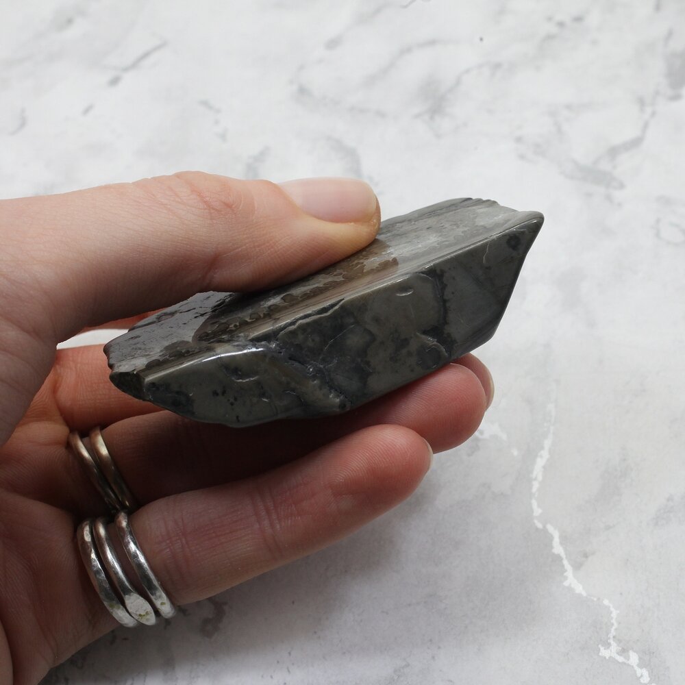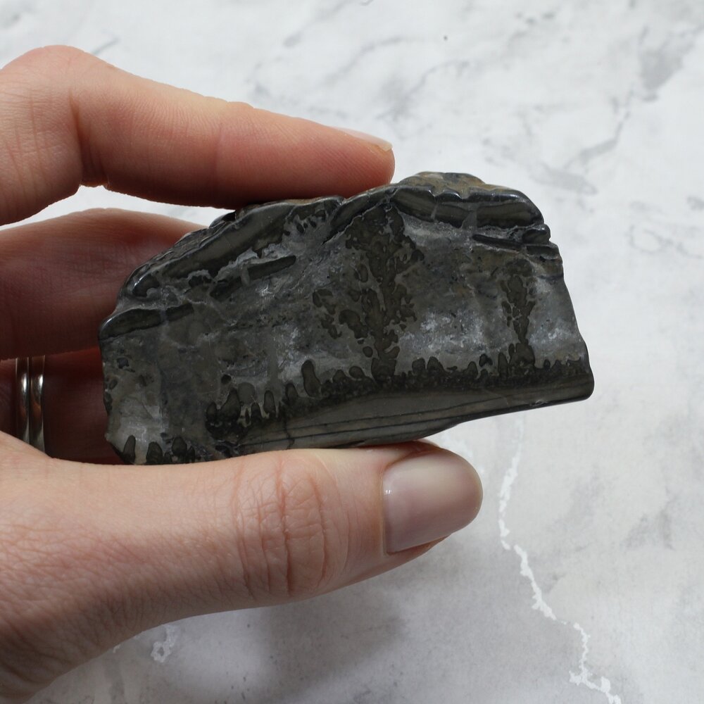 This mineral slice is cut from naturally occuring rock. The markings on the surface are natural, created by extinct and fossilised Algae, called Stromatolites many millions of years ago.