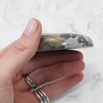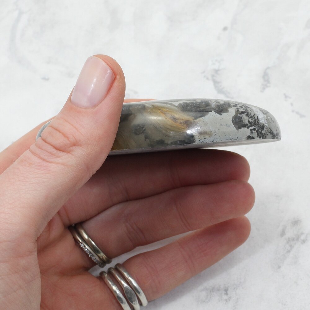 This mineral slice is cut from naturally occuring rock. The markings on the surface are natural, created by extinct and fossilised Algae, called Stromatolites many millions of years ago.