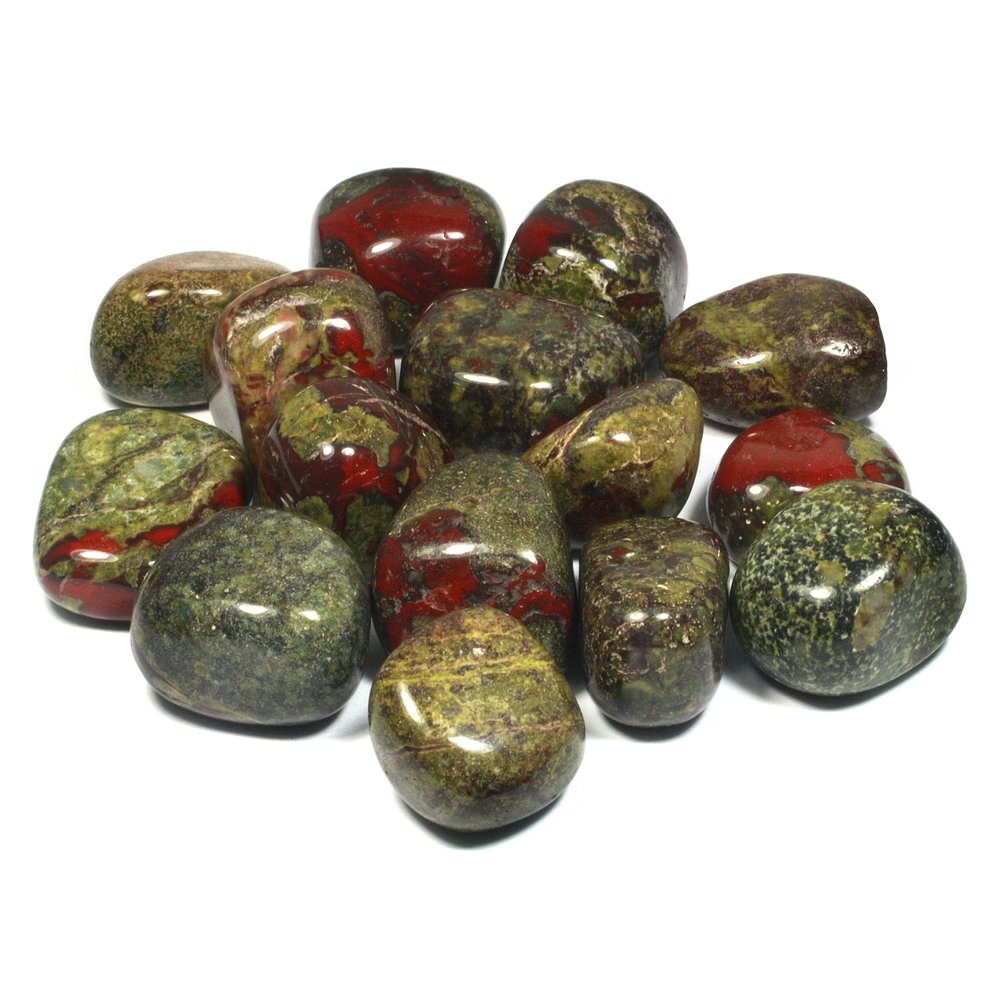 These Dragon's Blood Jasper Tumblestones display an amazing range of natural colours and patterns with deep red tones joined with a combination of forest green hues. Legend states that the stone is the remains of deceased ancient dragons - the green being the skin and the red the blood.