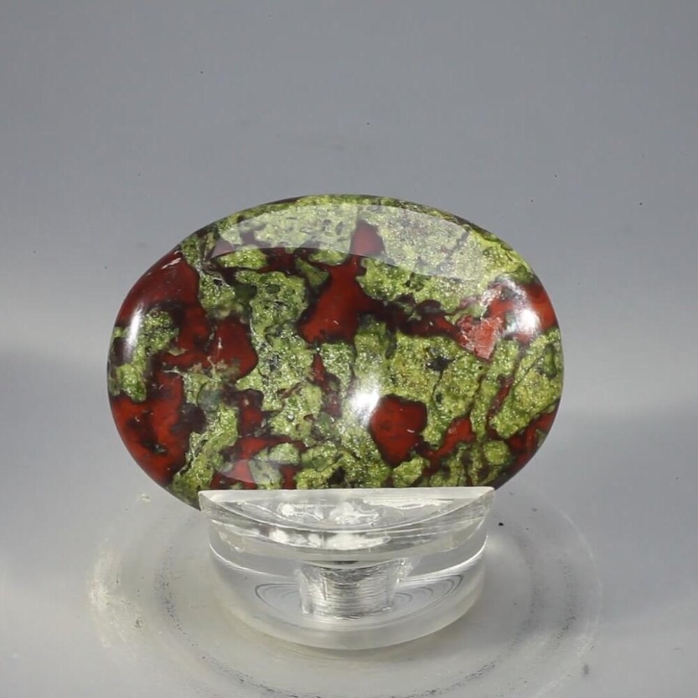 This Dragons Blood Thumbstone has been carefully shaped and polished to bring out the deep red and forest hues of the stone.  This thumbstone is the perfect size to hold and is said to relieve stress and harness the energy of the crystal.