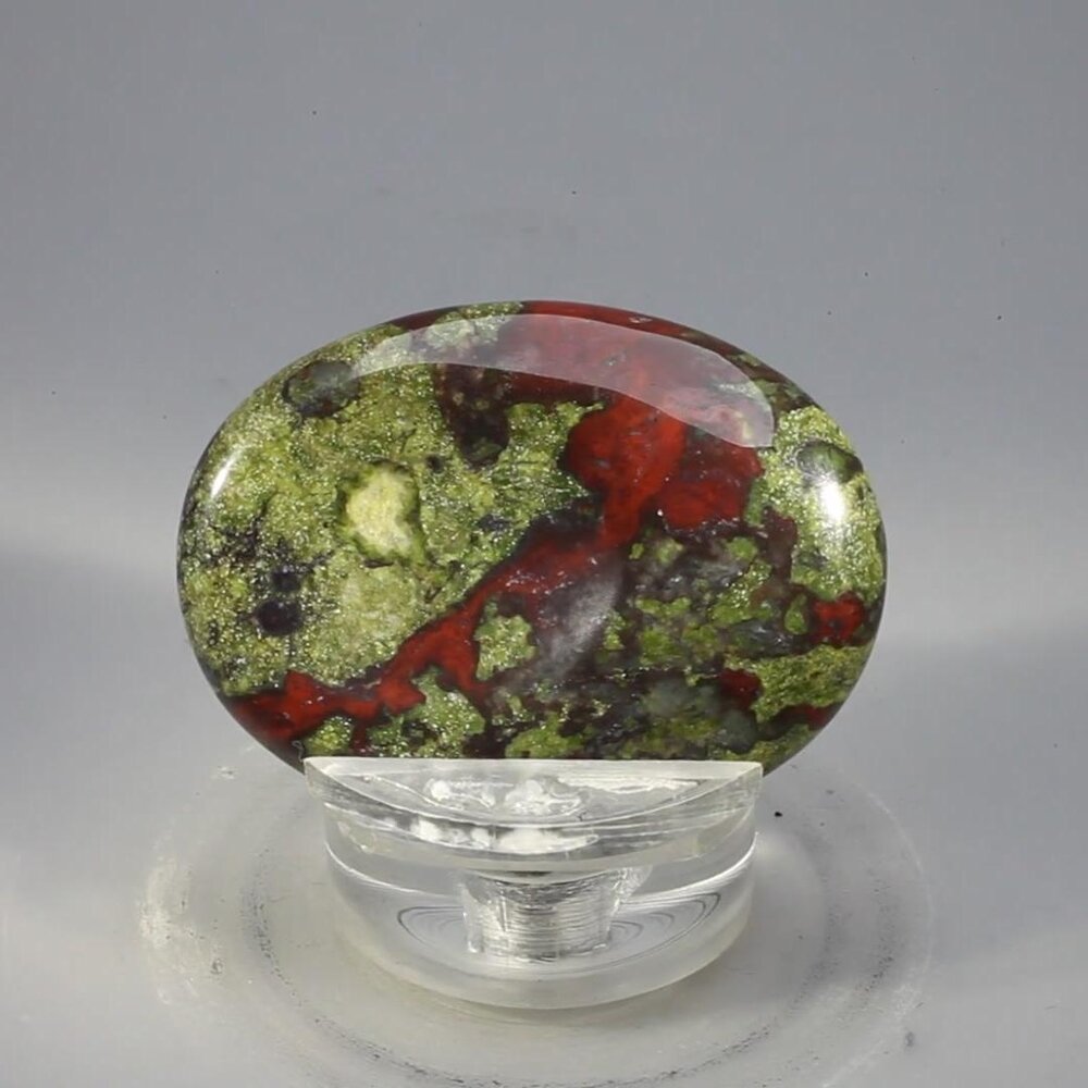 This Dragons Blood Thumbstone has been carefully shaped and polished to bring out the deep red and forest hues of the stone.  This thumbstone is the perfect size to hold and is said to relieve stress and harness the energy of the crystal.