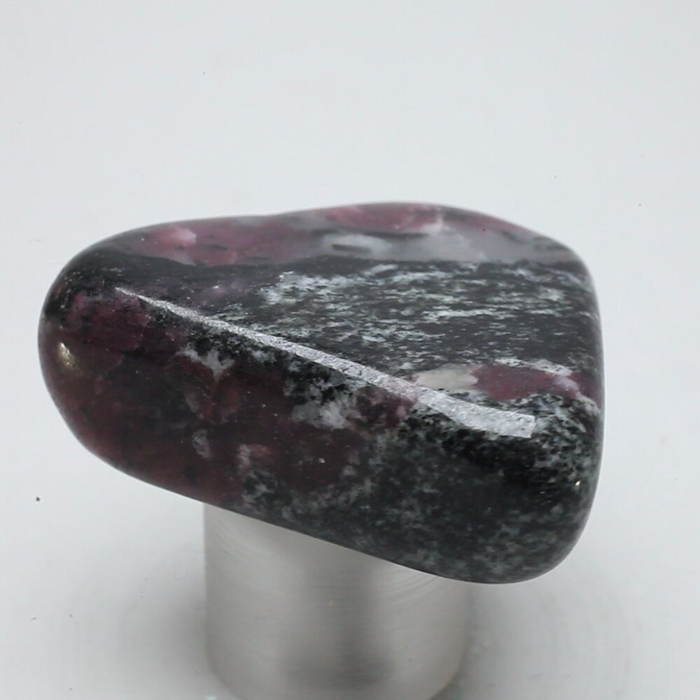 Ruby red Eudialyte, with black Aegirine. This tumblestone comes from Norra Karr, Sweden.