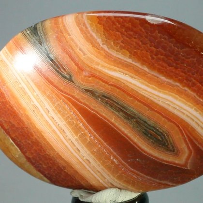 This Fire Agate Palmstone has been selected for its gorgeous range of orange and red tones. These colours are juxtaposed with smoky greys and pockets of transparency to create a beautiful marbled appearance.