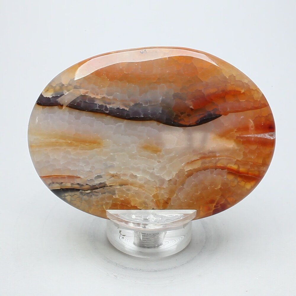 This Fire Agate Palmstone has been selected for its gorgeous range of orange and red tones. These colours are juxtaposed with smoky greys and pockets of transparency to create a beautiful marbled appearance.