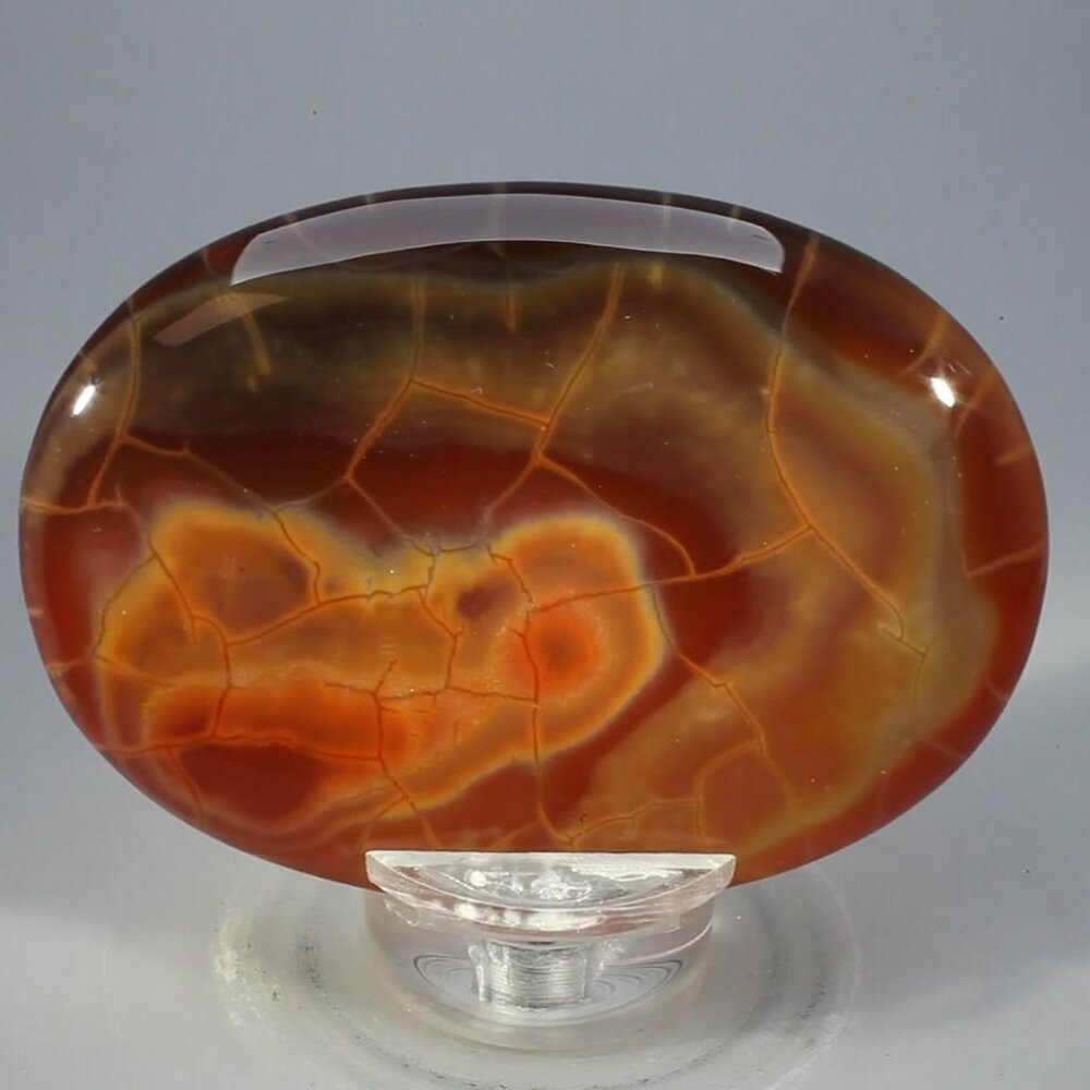 This Fire Agate Palmstone has been selected for its gorgeous range of orange and red tones. These colours are juxtaposed with smoky greys and pockets of transparency to create a beautiful marbled appearance.