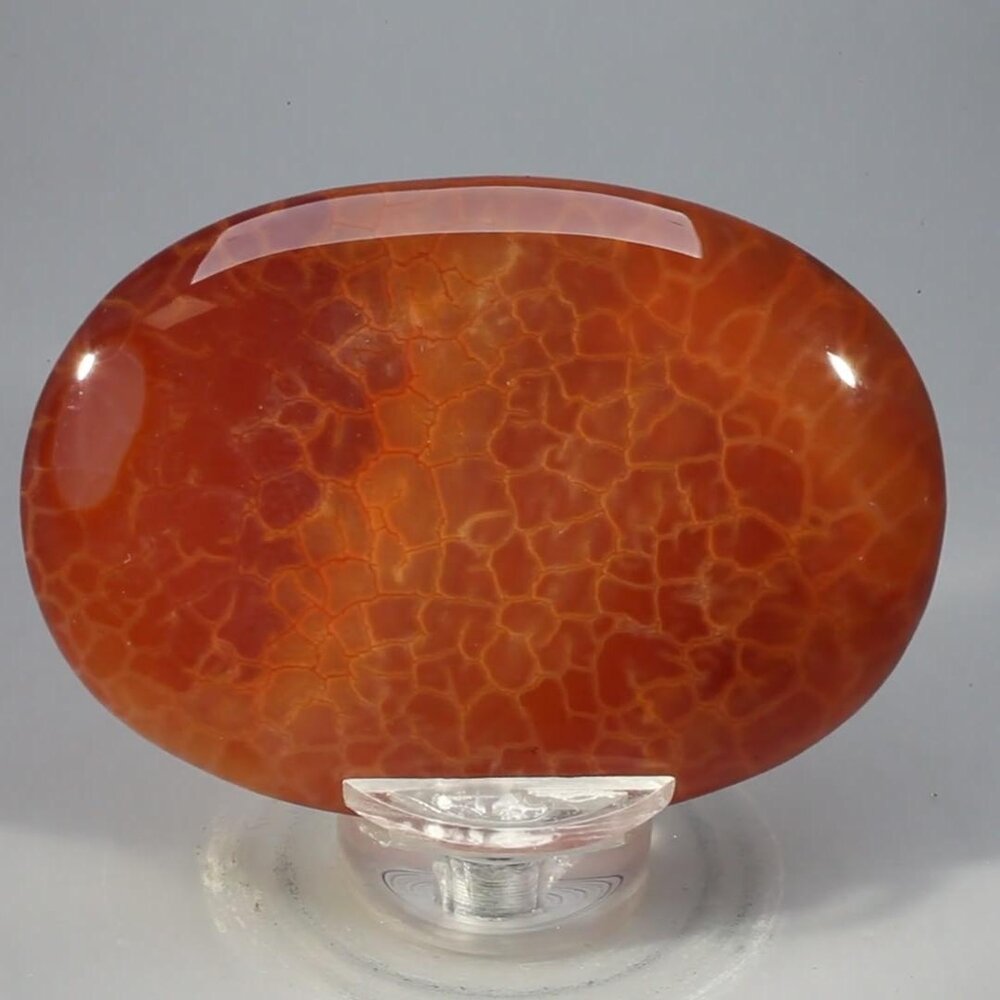 This Fire Agate Palmstone has been selected for its gorgeous range of orange and red tones. These colours are juxtaposed with smoky greys and pockets of transparency to create a beautiful marbled appearance.
