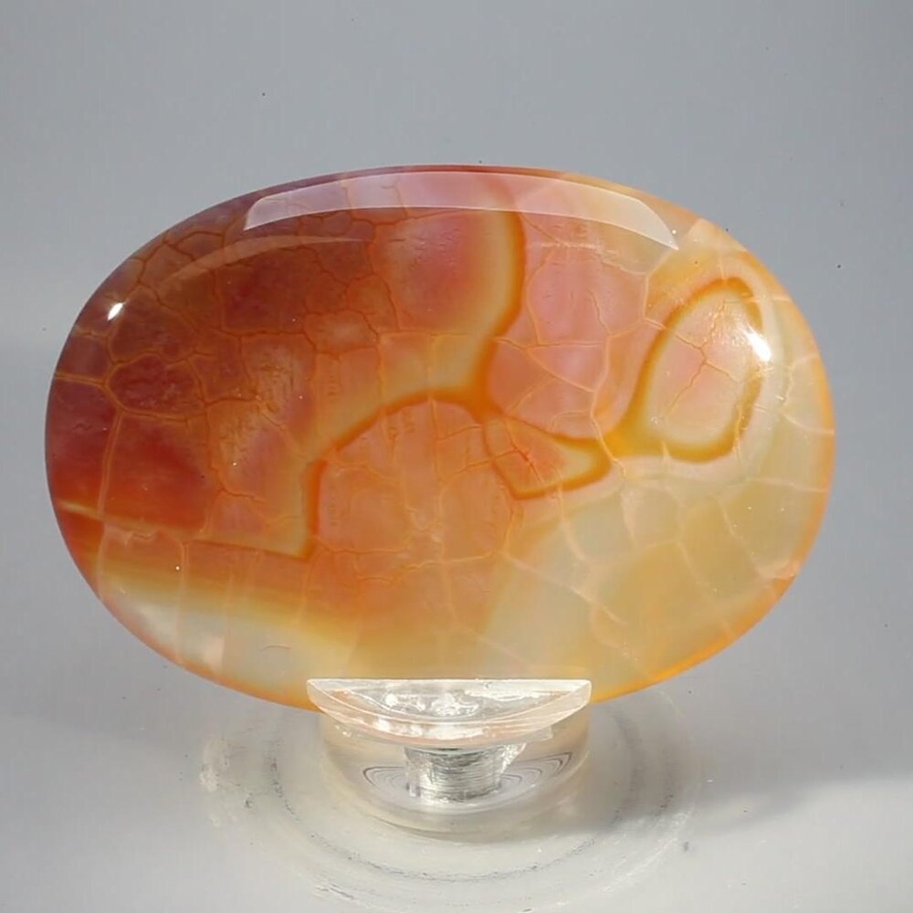 This Fire Agate Palmstone has been selected for its gorgeous range of orange and red tones. These colours are juxtaposed with smoky greys and pockets of transparency to create a beautiful marbled appearance.