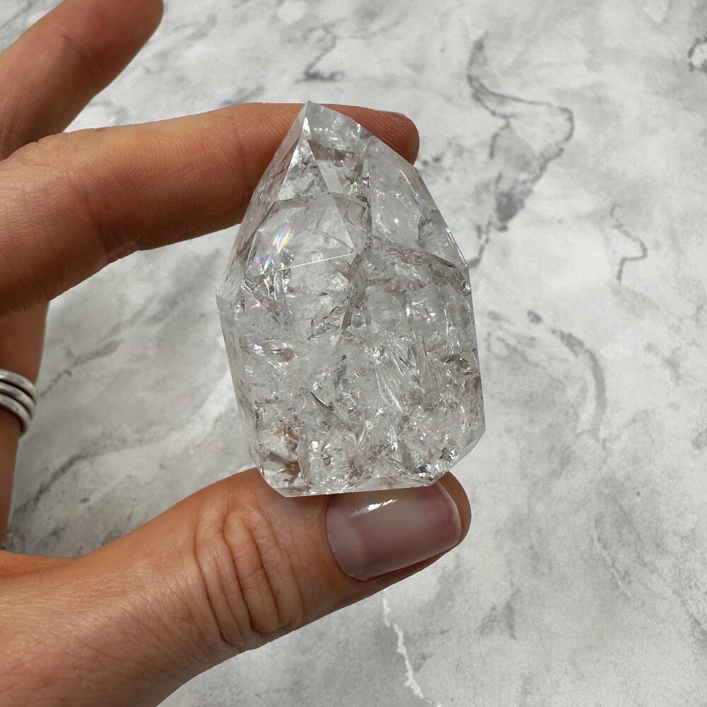 Feel the high vibrational energy open with this stunning Fire & Ice Quartz Point. Fire & Ice is the name given to a form of clear Quartz, silicon dioxide, from Brazil. This quartz is characterized by numerous internal fissures resulting in the appearance of rainbows within the crystalline matrix.