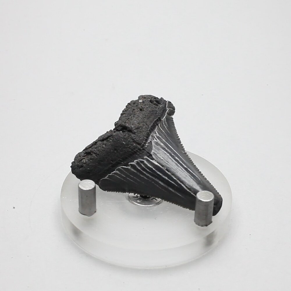 Megalodon teeth can be identified by their more regular triangular shape, robust structure, large size, fine edge serrations (not always visible on fossil remains), a lack of lateral denticles (side crowns), and the presence of a bourlette (the darker, chevron-shaped region near the tooth’s root). The largest Megalodon tooth found to date measures 7.1 inches on the diagonal, three times longer than any modern White Shark tooth!